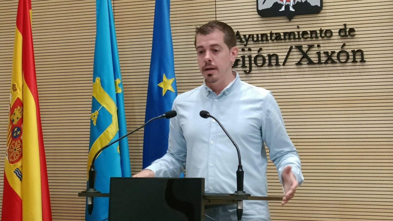 Javier Suárez Llana, portavoz de IU en el Pleno de Gijón, durante una rueda de prensa celebrada en la Casa Consistorial de la ciudad. / EP