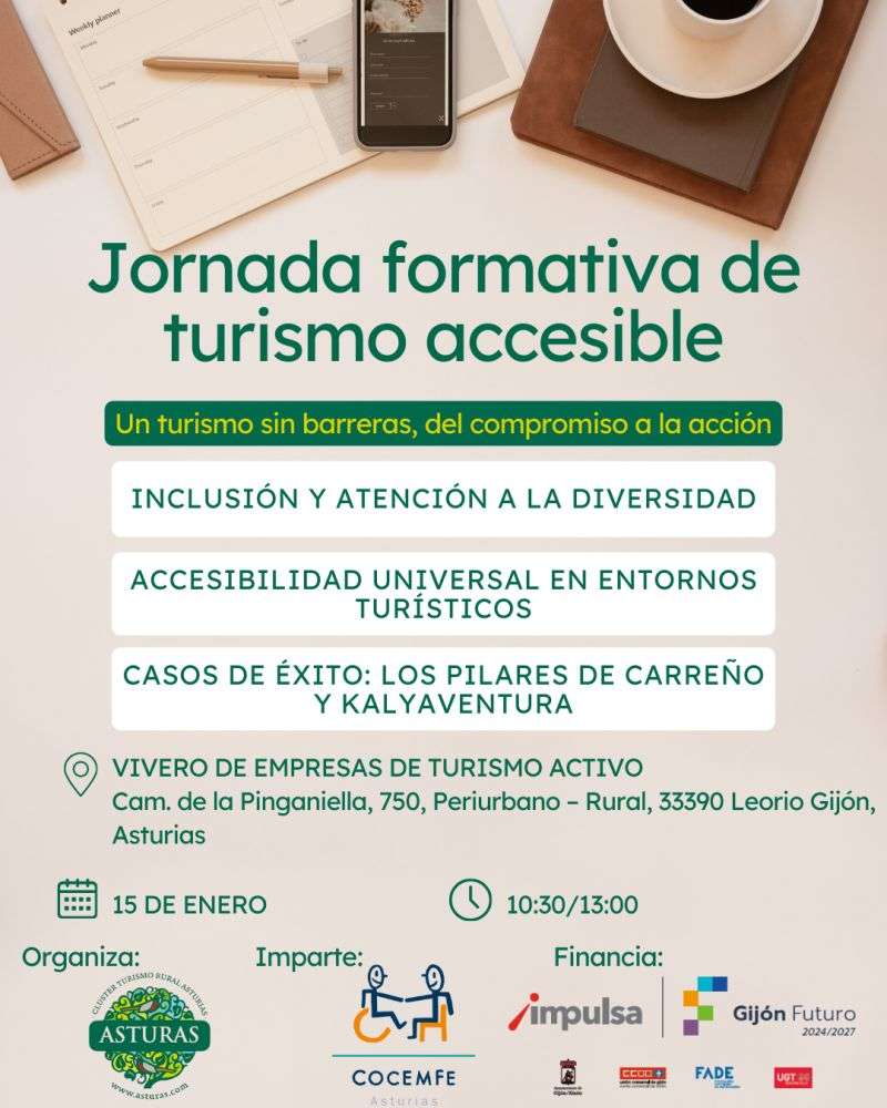 Desde el Clúster de Turismo Rural Asturas se organiza esta jornada financiada por el servicio municipal Gijón Impulsa, a través de la convocatoria de ecosistemas de desarrollo empresarial en su convocatoria de 2025, que estará centrada en la atención a la diversidad en entornos turísticos, e impartida por COCEMFE Asturias. Un encuentro pensado para avanzar hacia un turismo sin barreras, compartiendo herramientas prácticas y dos casos de éxito: Los Pilares de Carreño y Kalyaventura. Toda la información, al igual, que las inscripciones, están disponibles aquí.