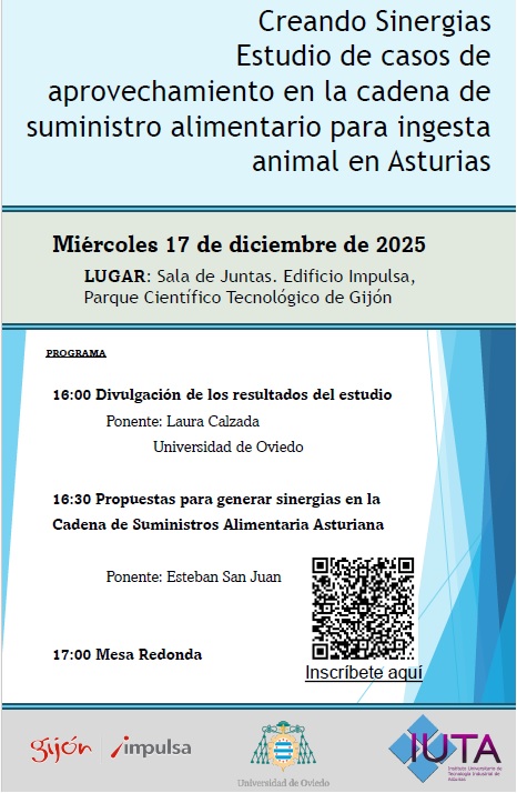 El Instituto Universitario de Tecnología Industrial de Asturias (IUTA) celebra en Gijón una nueva sesión de sus proyectos de investigación. En este caso, se disertará sobre el aprovechamiento en la cadena de suministro alimentario para ingesta animal en la región. Toda la información puede consultarse aquí.