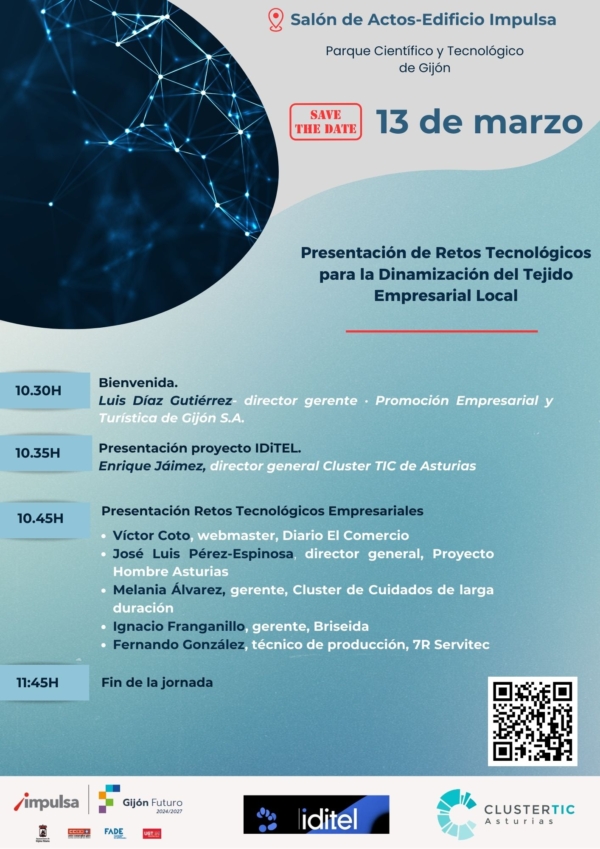 Desde el Clúster TIC de Asturias se organiza la jornada ‘Presentación de Retos Tecnológicos para la Dinamización del Tejido Empresarial Local’. Está enmarcada en el proyecto Innovación abierta y Disruptiva para la modernización del Tejido Empresarial Local (IDiTEL), financiado en la convocatoria de Incentivos al Ecosistema de Desarrollo Empresarial del Municipio de Gijón 2025, cuyo objetivo es fortalecer el tejido empresarial del municipio de Gijón y estimular la economía mediante la innovación abierta, promoviendo la conectividad y la cooperación entre empresas locales. Durante la jornada, cinco empresas tractoras asturianas presentarán los retos tecnológicos a los que se enfrentan, alineando sus necesidades con las potenciales soluciones innovadoras que las pymes tecnológicas locales puedan proporcionar. Información completa en este enlace.