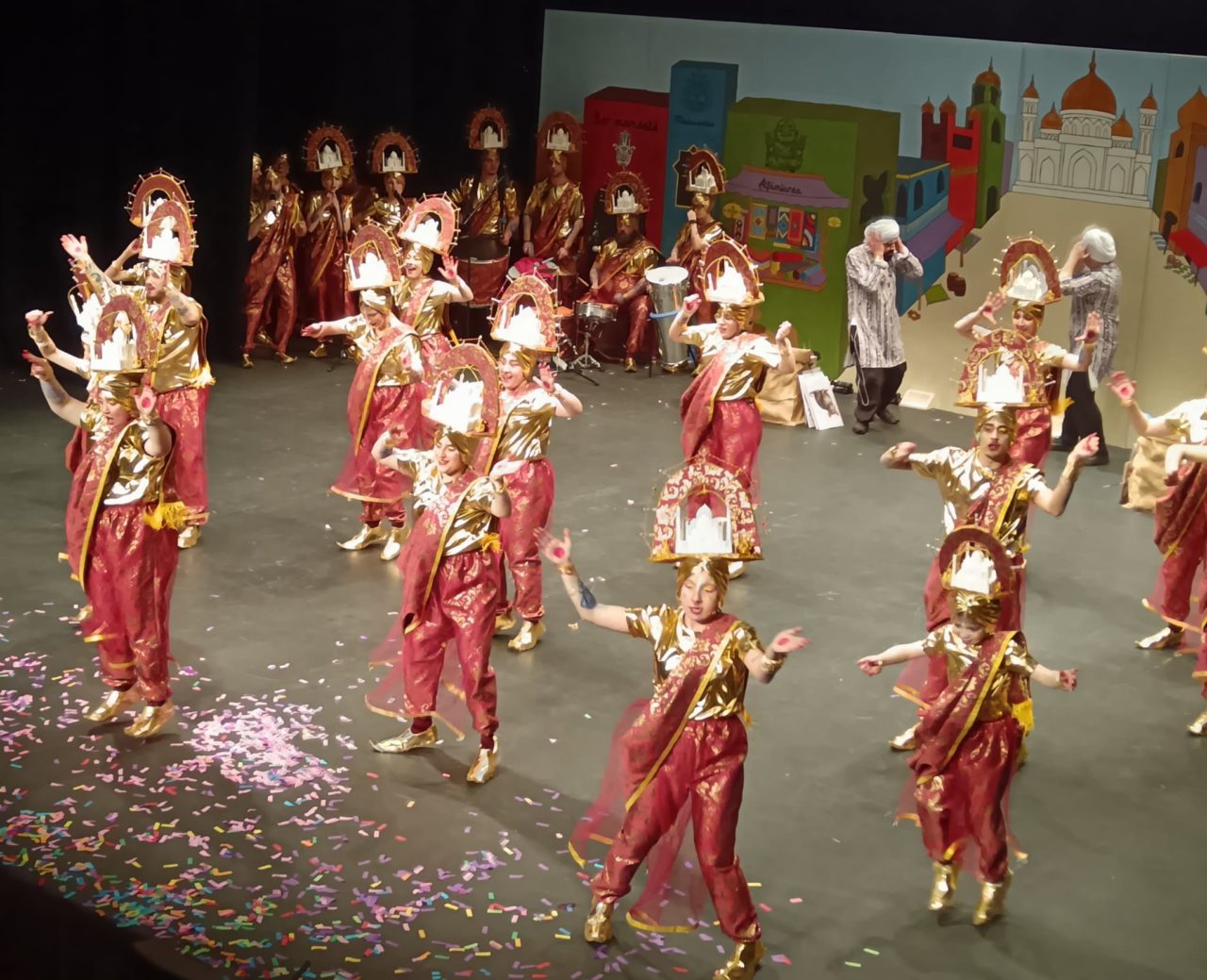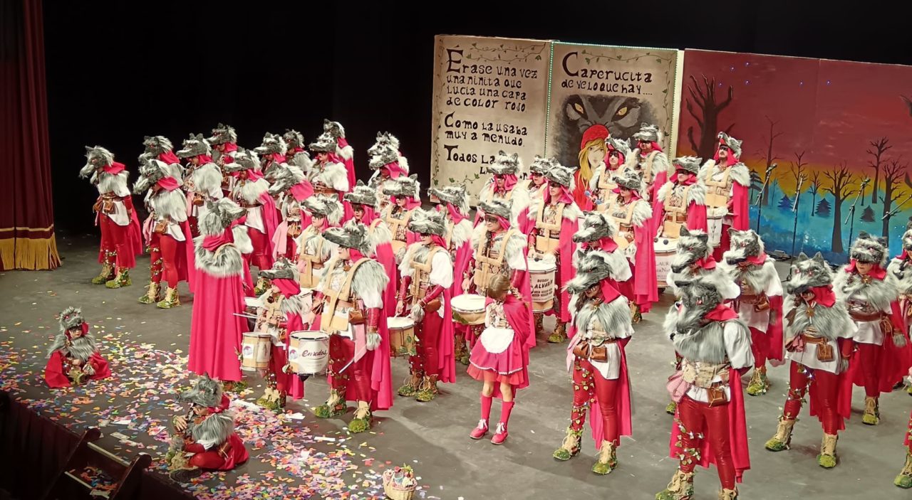 De un gran cuento salió al escenario una pequeña Caperucita, que rápidamente se vio rodeada de lobos. Eran los de Ye lo que Hay tarareando bien alto «quieren fiestas todo el año, pero sin preparar, y fuimos todas las charangas, tuvimos que protestar, para que haya una gran fiesta. Carmen Moriyón, deja ensayar».