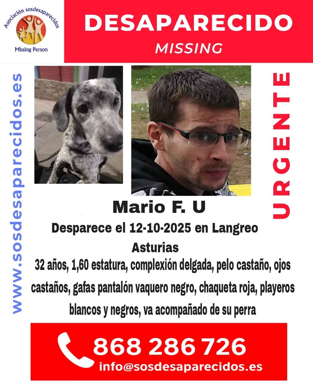 La Asociación SOS Desaparecidos ha emitido una alerta de búsqueda para localizar a Mario F. U., un hombre de 32 años que desapareció el 12 de octubre de 2025 en Langreo. Según la información difundida por la organización, el desaparecido mide 1,60 metros, es de complexión delgada, tiene el pelo castaño y ojos castaños. En el momento de su desaparición vestía un pantalón vaquero negro, chaqueta roja y playeros blancos y negros. Además, podría ir acompañado de su perra -que cuenta con chip identificativo-. La asociación solicita la colaboración ciudadana para recabar cualquier dato que pueda ayudar a su localización. Quienes dispongan de información pueden contactar a través del teléfono 868 286 726 o del correo electrónico info@sosdesaparecidos.es o a las Fuerzas y Cuerpos de Seguridad del Estado.