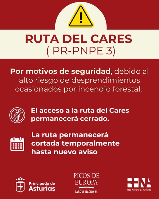 «Por motivos de seguridad, debido al alto riesgo de desprendimientos ocasionados por incendio forestal: El acceso a la ruta del Cares permanecerá cerrado. La ruta permanecerá cortada temporalmente hasta nuevo aviso», reza el mensaje difundido.