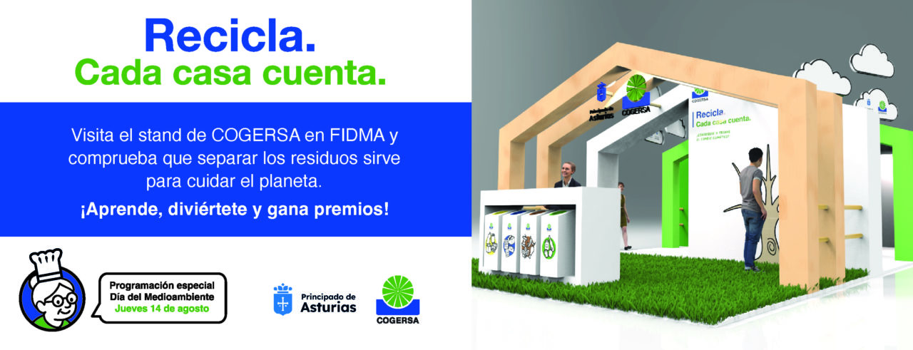 El Consorcio para la Gestión de Residuos Sólidos de Asturias (Cogersa) está presente en la Feria Internacional de Muestras de Asturias (Fidma), que este año celebra su 68ª edición. El estand de la entidad pública reproduce una vivienda y se centra en llamar a la ciudadanía a seguir participando en la separación de papel, envases, vidrio, materia orgánica y restos especiales (peligrosos y voluminosos), tal y como recuerda su eslogan: “Recicla, cada casa cuenta”.