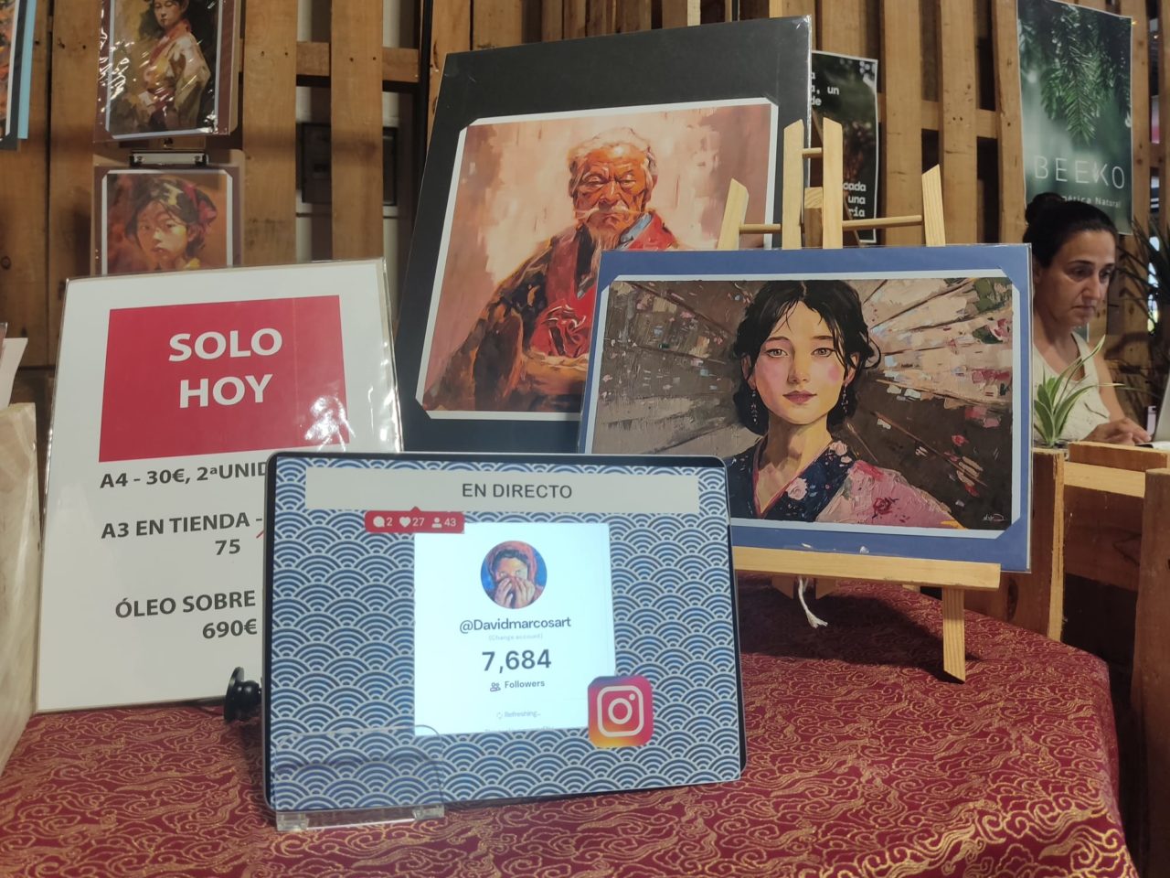 «Era vital; sin esa ayuda, no sé dónde estaría en este momento…«, reflexiona un agradecido Marcos, rodeado por los cuadros y elementos de atrezzo, todo ello íntimamente ligado al mundo nipón, que dan forma a su vistoso stand. Y es que el mismo espacio da fe de la madurez que su proyecto ha vivido en estos doce meses… «El año pasado quizá no lo tenía tan bien montado, pero esta vez está más trabajado, y he venido con una veintena de obras nuevas, tanto en formato A3 como A4«, detalla. Claro, que su papel en FIDMA no se limitará a exhibir su trabajo. También servirá de escaparate para introducir al público en otros proyectos que ya bullen en su mente, no necesariamente tan vinculados a Japón. Es el caso, por ejemplo, de una apuesta para explicar a los asistentes los secretos que esconden ciertas piezas y artistas clásicos, como Rembrandt o Goya, al igual que obras realizadas mediante enfoques más rompedores. Mi meta es que lograr que a la gente le apetezca acercarse al arte, que las personas no se sientan idiotas cuando entran en una galería o en un espacio de arte conceptual, y les digan ‘El plátano en la pared no te gusta porque no lo entiendes’«, comparte, risueño.