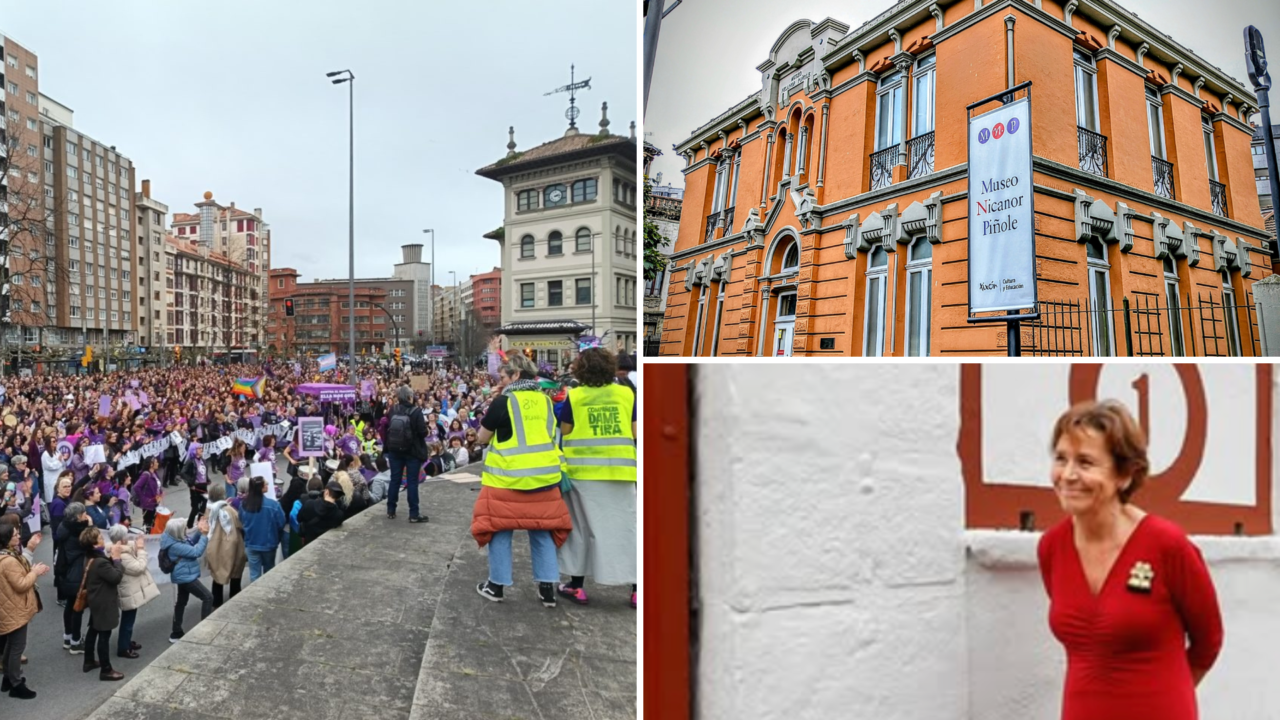 Desde la izqda. Manifestación feminista durante los actos del 8M en Gijón; Imagen exterior del Museo Nicanor Piñole; Carmen Moriyón, alcaldesa de Gijón