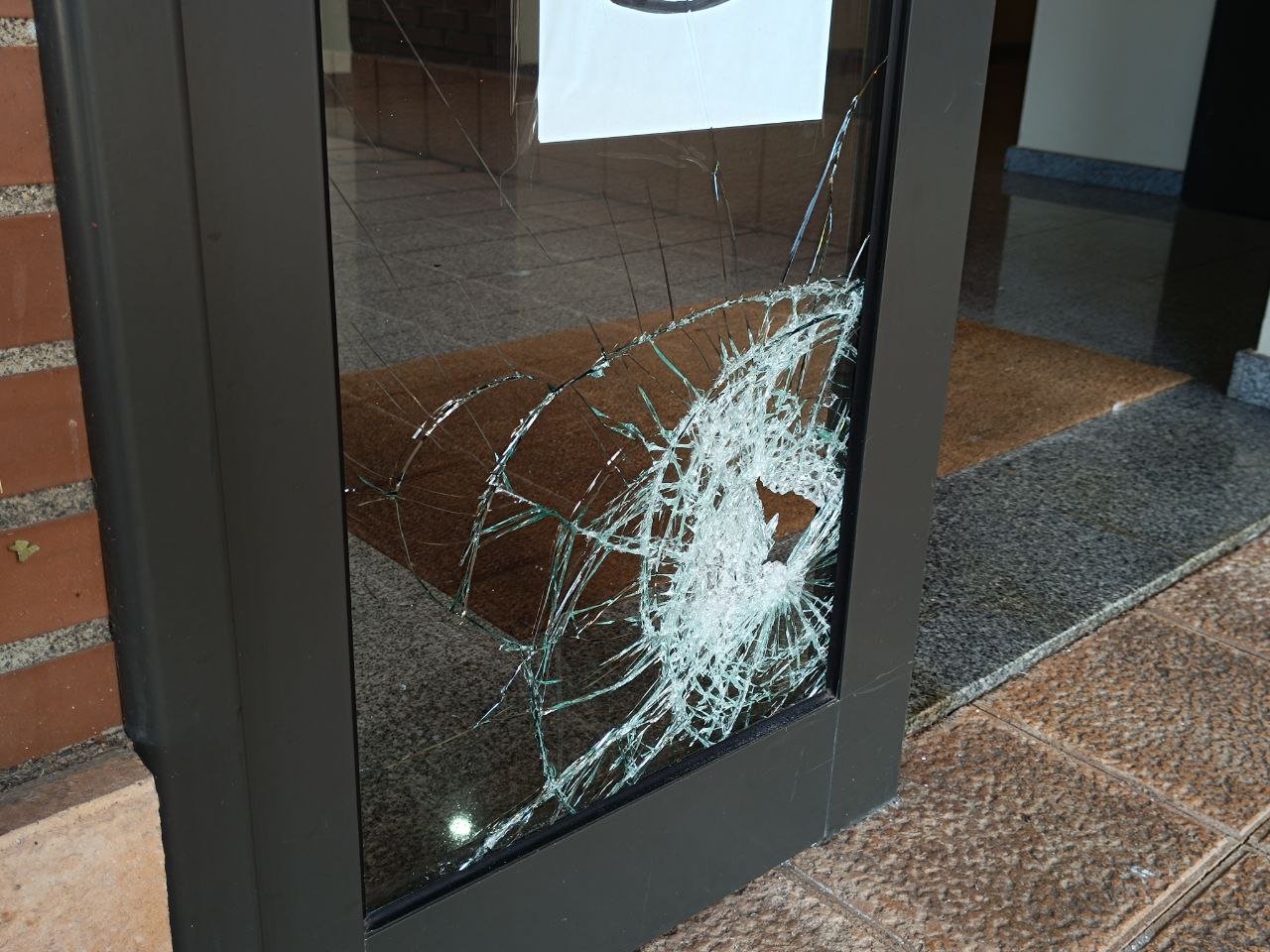El cristal apareció roto por «un golpe intencionado» en la parte inferior; la situación de «desamparo legal» en su conflicto con la SAREB, al no poder contar con la figura de presidente de la comunidad o administrado de fincas, impide a los vecinos poner una denuncia ante la Policía