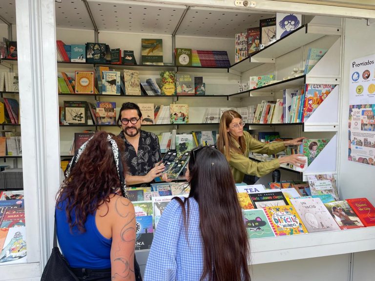Carvajal habla con dos visitantes a una feria. / La Maleta Ediciones