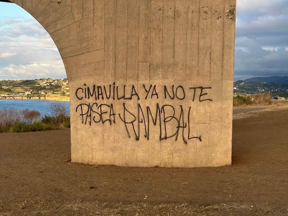 El críptico mensaje «Cimavilla ya no te pasea, Rambal» ‘decora’ uno de los costados la emblemática escultura de Chillida; por el momento, no han trascendido ni la autoría, ni la intención del acto