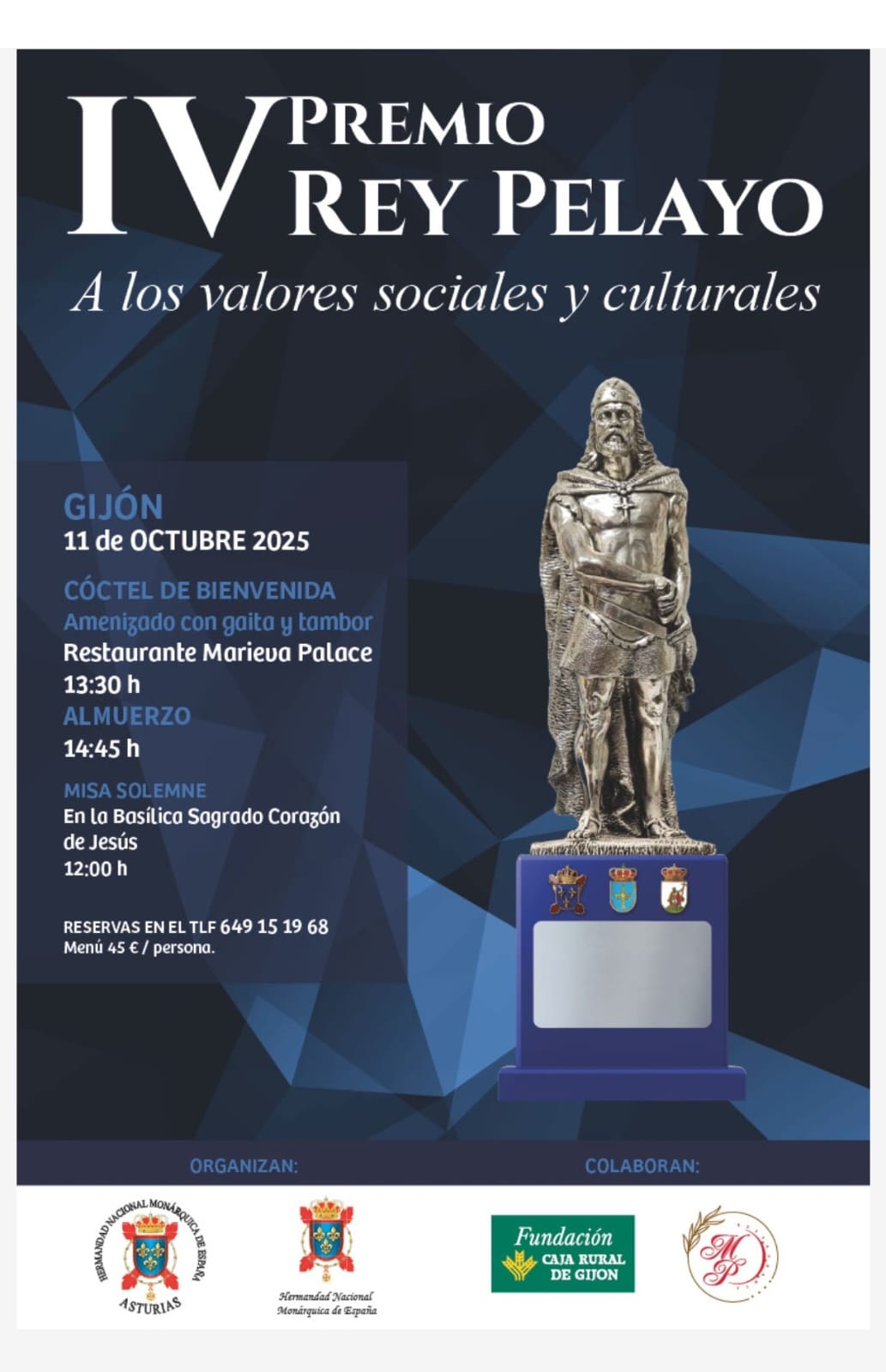 El próximo 11 de octubre, Gijón será escenario de la entrega del IV Premio Rey Pelayo “A los valores sociales y culturales”, una distinción promovida por la Hermandad Nacional Monárquica de España y su delegación en Asturias, con la colaboración de la Fundación Gijón Rural y el Restaurante Marieva Palace.