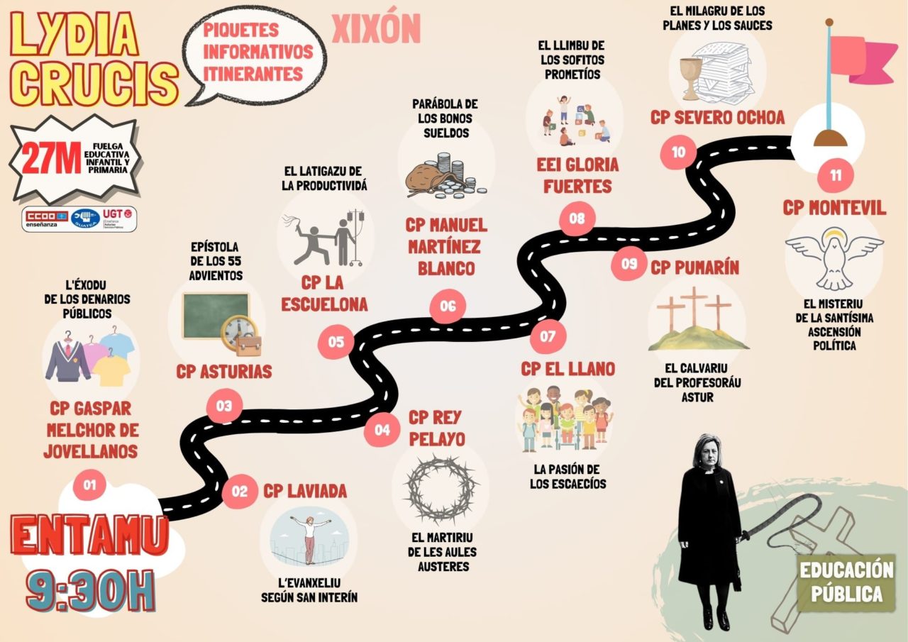 «Bienaventurados los precarios, porque ellos conocen el significado de la palabra esperanza y también de la palabra cese» fue una de las frases satíricas en forma de bienaventuranzas leídas por el piquete informativo convocado esta mañana por los sindicatos CCOO, UGT y SUATEA con motivo de la huelga en Primaria e Infantil que se celebra hoy. Fue denominado ‘Lydia Crucis’, con, en este caso, sólo once paradas, «para que nos escuche la comunidad educativa y sobre todo los compañeros de servicios mínimos, que fueron abusivos, y no se pudieron unir esta mañana y no van a poder venir hasta por la tarde, para que ellos también tengan derecho a protestar», explicó Patricia Barranco, maestra de Primaria en el avilesino CP Versalles.