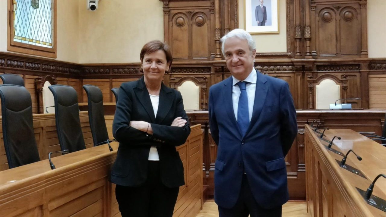 El presidente del Tribunal Superior de Justicia de Asturias, Jesús María Chamorro, en el Salón de Plenos del Ayuntamiento de Gijón, acompañado de la alcaldesa gijonesa, Carmen Moriyón. / EP