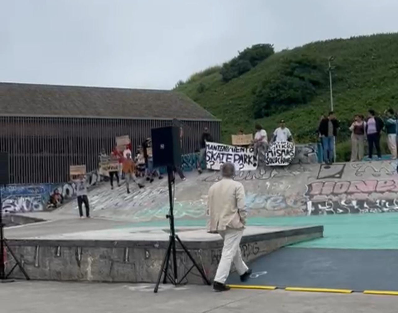 Una protesta protagonizada por una decena de usuarios por la situación de la instalación obligó a parar el acto previsto en la mañana del sábado en el espacio que lleva ahora el nombre del ‘héroe del monopatín’ que perdió la vida en el atentado de Londres de 2017