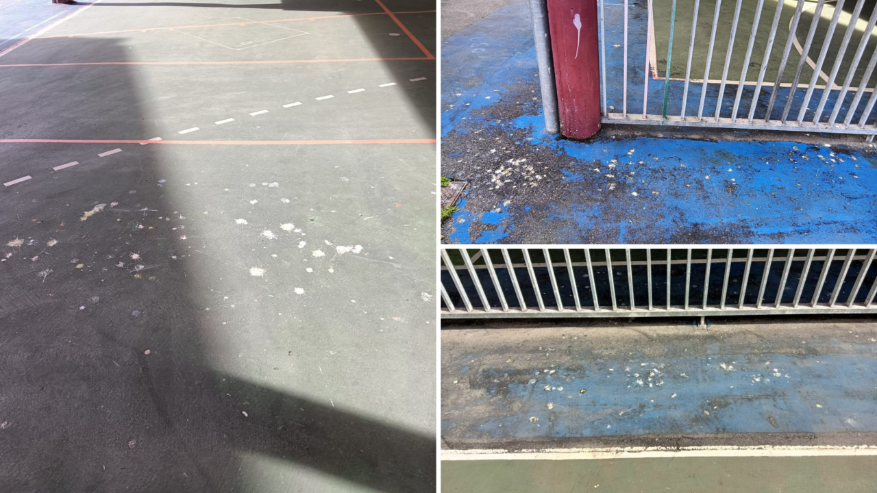 El problema de insalubridad por excrementos de palomas también afecta a la pista del CP Santa Olaya: «Es asqueroso y sucio»