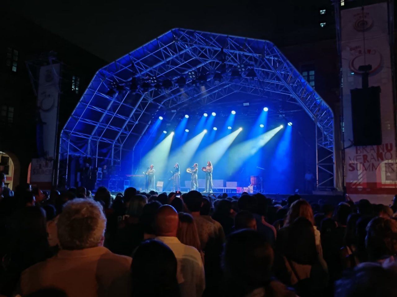 Un momentu de l’actuación de Fillas de Cassandra, que convocaron a un públicu entregáu na Plaza Mayor nel conciertu inaugural del Arcu Atlánticu. / miGijón