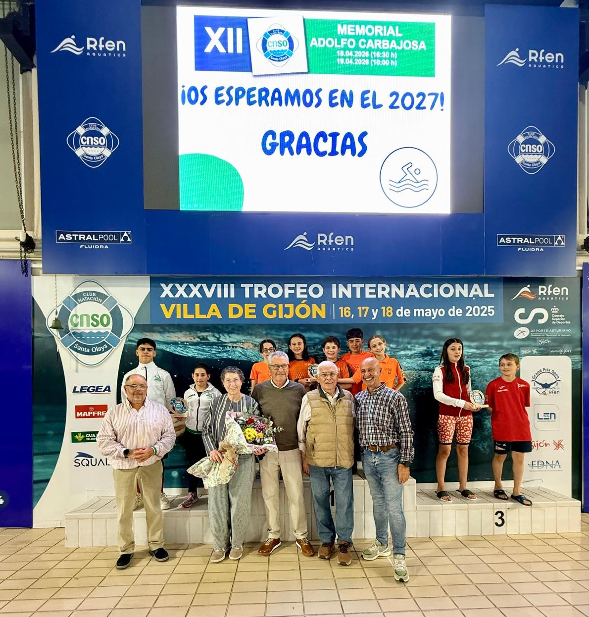 Gran fin de semana de natación el vivido este fin de semana en la piscina del Santa Olaya, que acogió el XII Memorial Adolfo Carbajosa con lleno de público en las dos jornadas y récord de participación. 434 nadadores pertenecientes a 16 clubes de Asturias, Cantabria, Castilla y León, Galicia y Madrid, 231 niñas y 203 niños, participaron en las diferentes pruebas de categoría prebenjamín, benjamín, alevín e infantil de esta competición que rinde homenaje a una de las figuras clave en la historia del club de El Natahoyo y que refuerza su compromiso con este deporte y el desarrollo deportivo en edades tempranas.