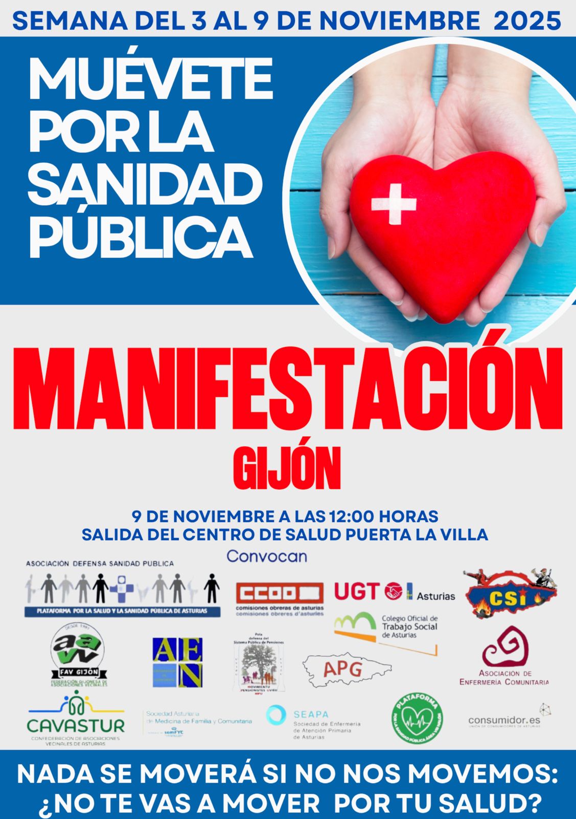 Las entidades ciudadanas y sindicales que integran la Plataforma por la Salud y la Sanidad Pública convocan una manifestación que saldrá a las 12 horas del Centro de Salud de Puerta de la Villa, y que recorrerá varias calles del centro de Gijón