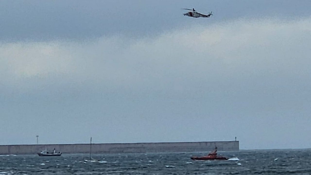 La embarcación, de pequeño tamaño, fue zarandeada por el fuerte oleaje, y el viento desgarró su velamen; una lancha y un helicóptero de Salvamento Marítimo, junto con un pesquero, la han escoltado hasta la seguridad del Puerto Deportivo