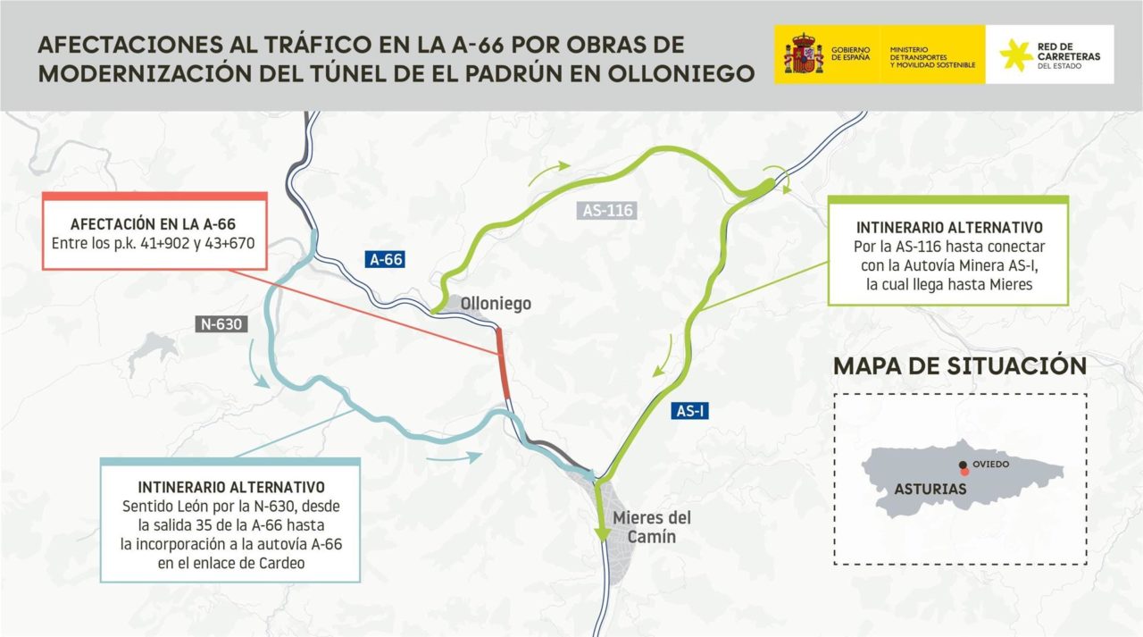 El Ministerio de Transportes y Movilidad Sostenible ha informado de que la circulación se cortará en el túnel de El Padrún, en sentido León, desde este lunes 29 de septiembre hasta el jueves 2 de octubre, en horario nocturno de 22.00 a 7.00 horas con motivo de las obras de modernización y mejora de la seguridad de los túneles de Ángel Uriel y El Padrún, de la autovía A-66 en Asturias.