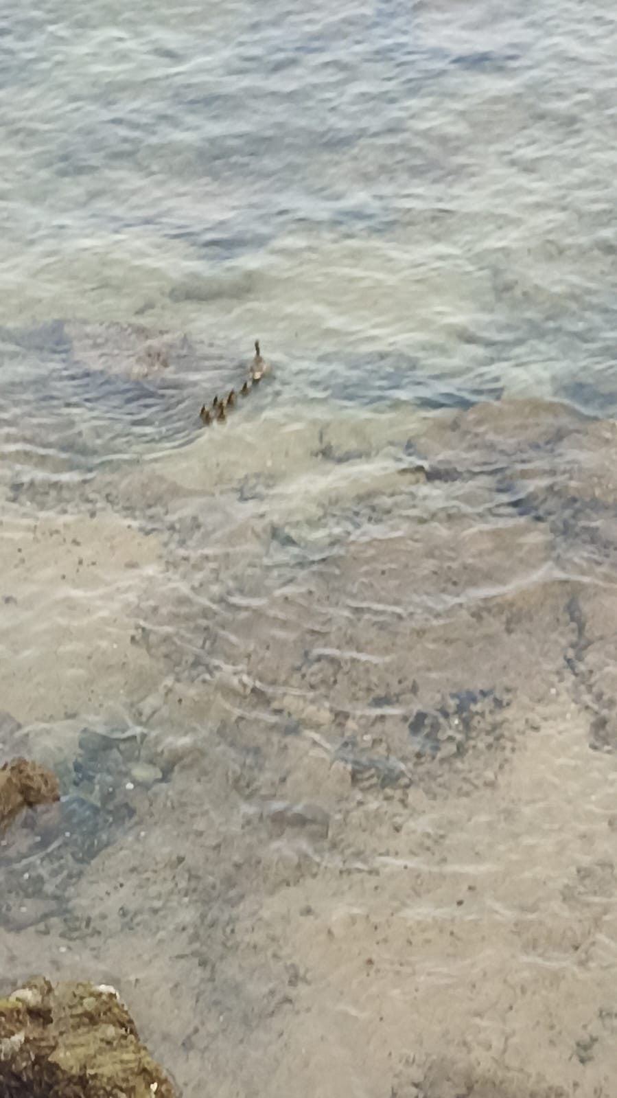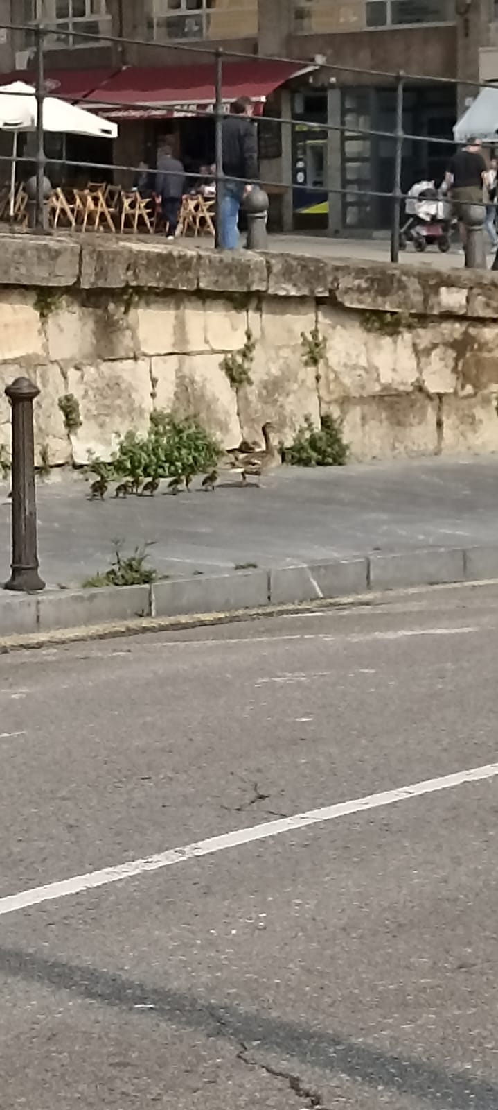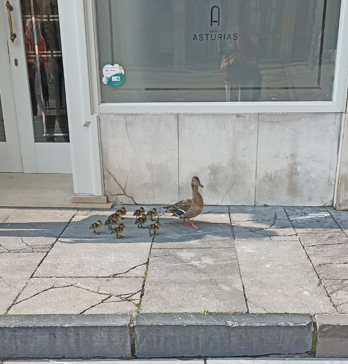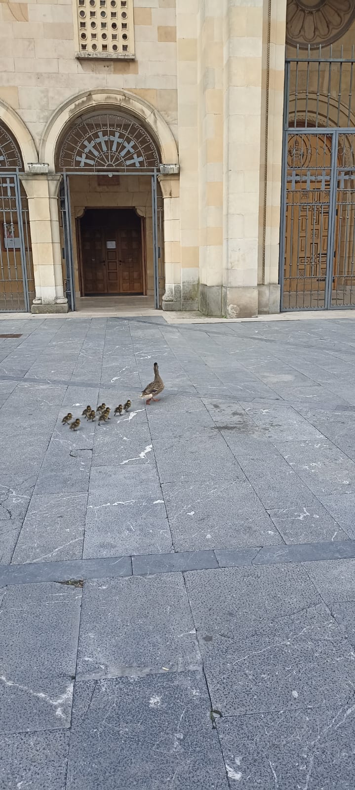 Una pata y sus patitos revolucionaron la tarde del martes en la zona de El Muelle y Campo Valdés; su aventura tuvo un momento de nerviosismo por, según el testimonio de los testigos, la incapacidad de la madre de salir del pórtico de la iglesia, y un final agridulce a su llegada a la playa