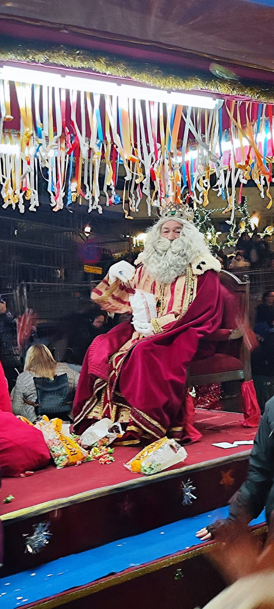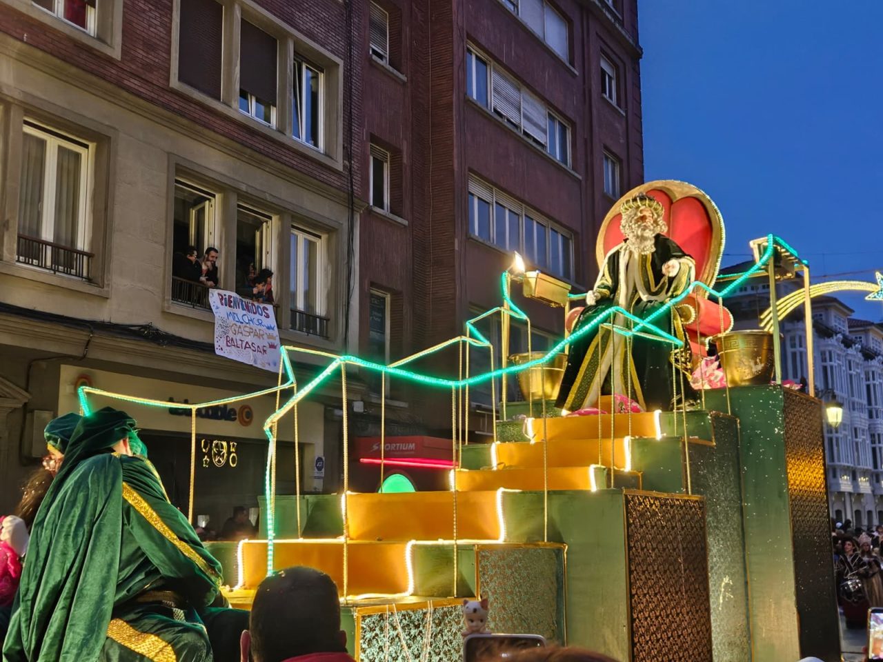 Melchor, en su carroza de la cabalgata, que adelantó su hora para evitar la lluvia / Ayuntamiento de Oviedo