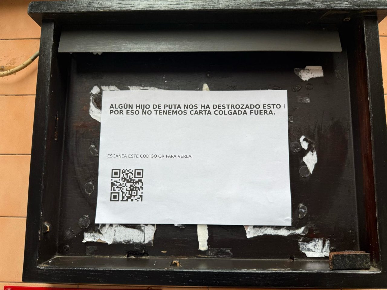 Afortunadamente, los atacantes no lograron penetrar en el establecimiento, y desde entonces la actividad en el restaurante ha proseguido sin alteraciones… Aunque sí han sido muchos los comentarios que Roguez ha recibido. Sobre todo, desde que, a la mañana siguiente, optase por colocar en el cajetín de los menús cierto cartel para explicar las causas de su deplorable apariencia… Bastante directo, toda vez que el mensaje reza «Algún hijo de puta nos ha destrozado esto, por eso no tenemos carta colgada fuera«. La propia chef admite que «mucha gente se para delante, muerta de la risa«; un matiz alegre que, no obstante, no impide por completo que diferentes teorías se abran camino. «Se me pasa mucha gente por la cabeza pero, sinceramente, es raro que tengas tan mala suerte dos veces en la misma noche… Debió ser la misma persona, y sabiendo lo que hacía y a quién«, comparte. La cuestión, de todos modos, tendrán que resolverla las autoridades, en cuyas manos está ahora el caso.