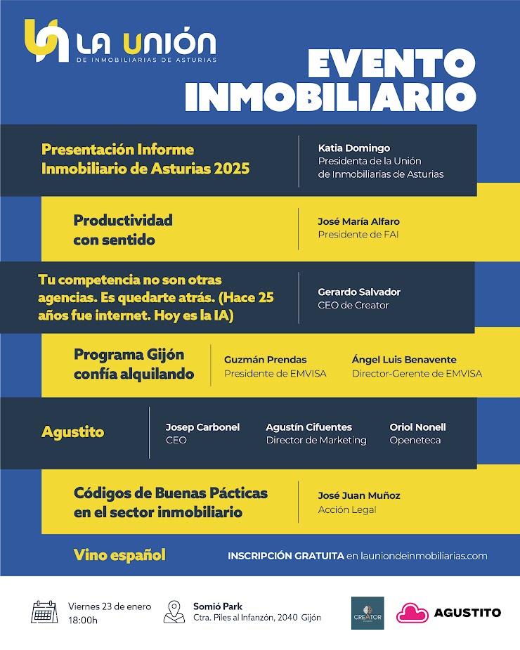 La Unión de Inmobiliarias de Asturias celebrará el próximo viernes 23 de enero de 2026, a partir de las 18:00 horas, su evento anual del sector inmobiliario, una cita ya consolidada en el calendario profesional asturiano. El encuentro tendrá lugar en el Restaurante Somió Park (Carretera de Piles al Infanzón, 2040, Gijón) y reunirá a agentes inmobiliarios, directivos, expertos y profesionales vinculados al mercado de la vivienda.