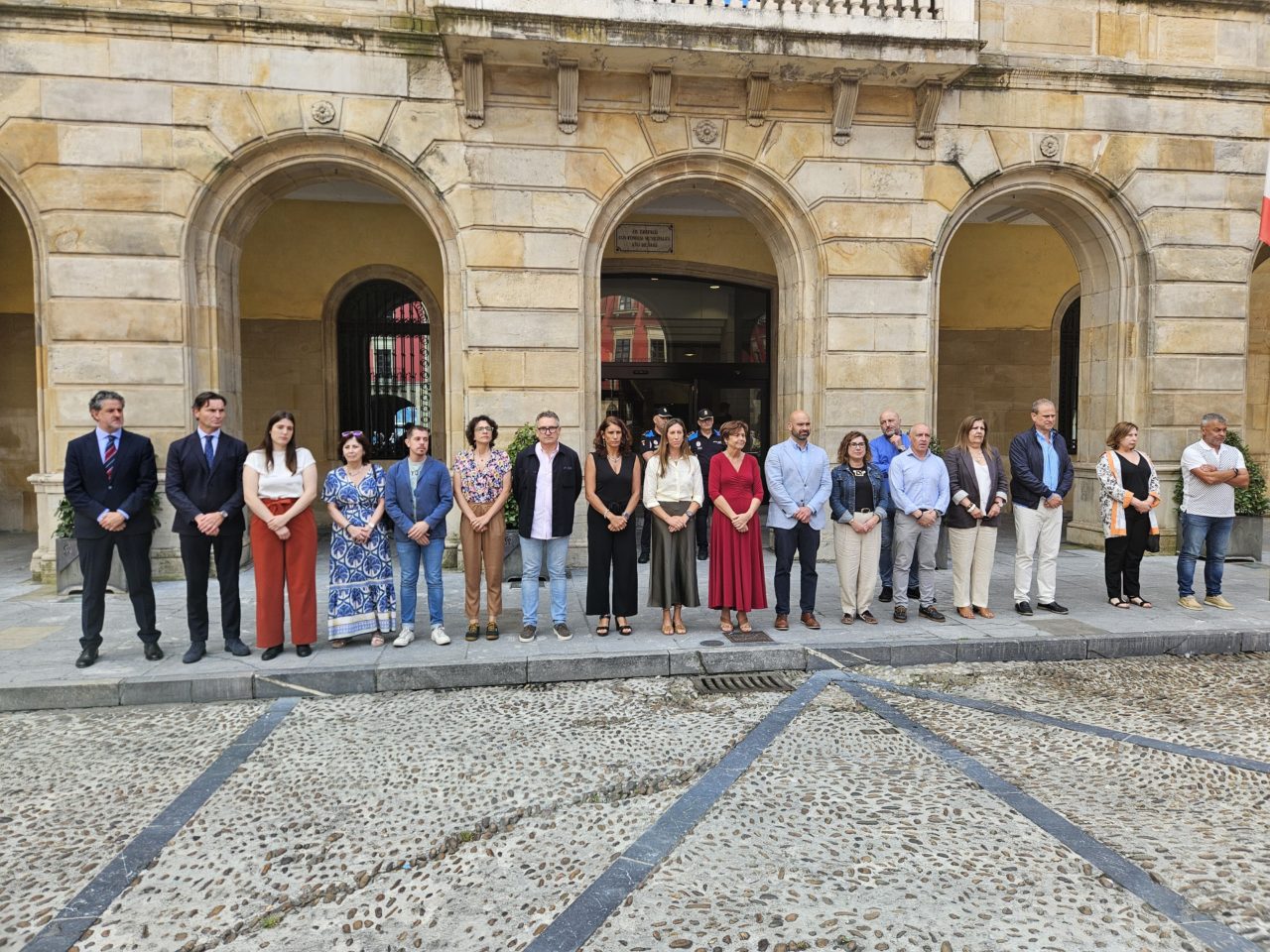Los territorios de Laviana, Asturias y, también, España entera continúan conmocionados desde que, en la mañana de este miércoles, se supiese de la muerte violenta de Dolores F., de 86 años y vecina de dicho municipio, presuntamente a manos de su marido, de 90 años. Desde entonces, las muestras de pesar y condena se han sucedido en distintas partes de la región, emitidas tanto por ciudadanos de a pie, como por instituciones de toda clase. Y, si bien el acto oficial de repulsa, convocado por la Plataforma ‘Asturies Feminista 8M’, se celebrará a las 17 horas de esta tarde, ante la Casa Consistorial de Laviana, algunos concejos han preferido, o debido, adelantarse a ese momento. Ese ha sido el caso de Gijón, cuya Corporación, excepto Vox, se ha concentrado frente al Ayuntamiento a las 12, y ha guardado un minuto de silencio en recuerdo de la fallecida, y contra toda forma de violencia machista. Un gesto simbólico observado y secundado, desde la plaza Mayor, por decenas de vecinos y turistas, muchos de los cuales no han dudado en inmortalizarlo.
