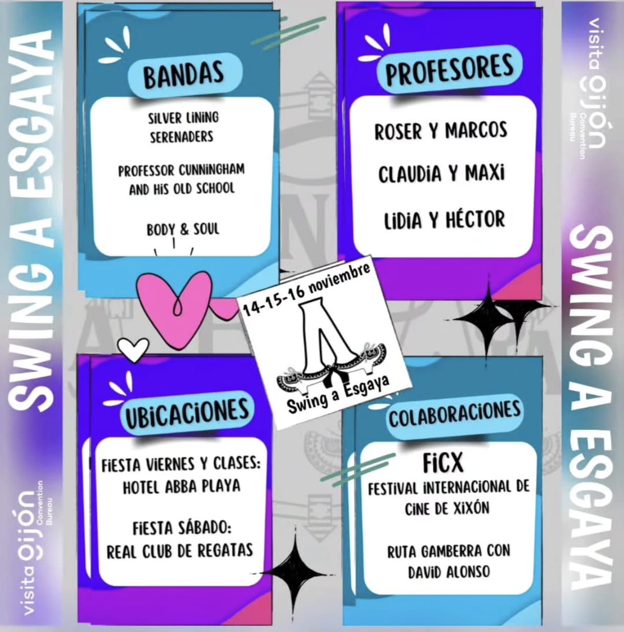 Ahora bien, si por lo que te mueres de amor es por la música swing, ese jazz originario de los años 20 en los Estados Unidos, tendrás la oportunidad de dar giros sin parar ante profesores llegados de la misma Argentina. El II Festival Swing a Esgaya, comenzará con un recibimiento de todos, que son muchos, los que han querido sumarse a las clases magistrales, con Roser y Marcos; Claudia y Maxi además de Lidia y Héctor.
