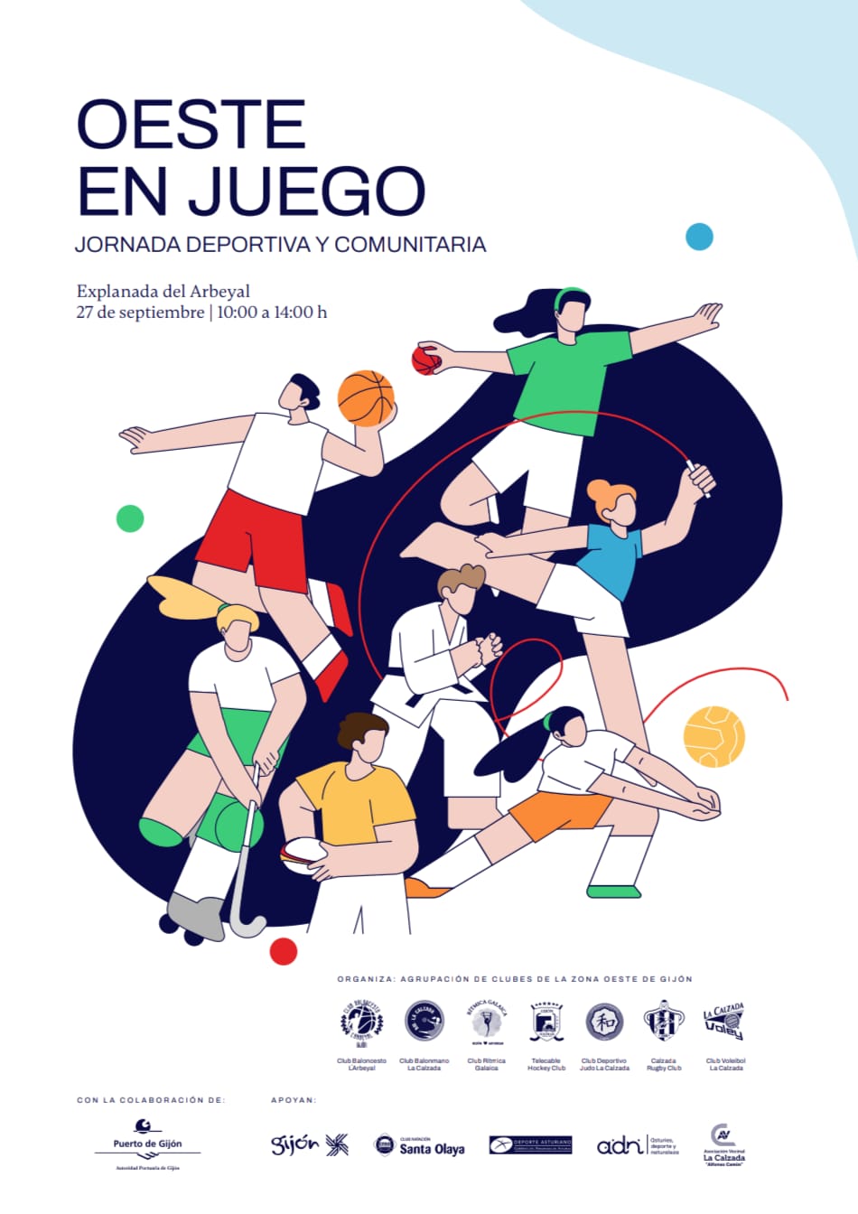 Los protagonistas serán los clubes participantes: el Club Deportivo Judo La Calzada, el Club Rítmica Galaica, el Telecable Hockey Club, el Club Baloncesto L’Arbeyal, el Club Balonmano La Calzada, el Club Voleibol La Calzada y el Calzada Rugby Club. Todos ellos ofrecerán demostraciones y dinámicas participativas en sus respectivos espacios, además de informar sobre sus actividades y trayectoria. La programación incluye exhibiciones de judo y gimnasia rítmica, un partidillo de rugby en la arena, propuestas de baloncesto, balonmano y voleibol, así como actualizaciones en directo sobre el partido del Telecable Hockey en Lloret de Mar. También habrá concursos y sorteos con preguntas deportivas, talleres para los más pequeños y un baile colectivo como cierre. La organización anima a los asistentes a compartir la experiencia en redes sociales con la etiqueta #OesteEnJuego.