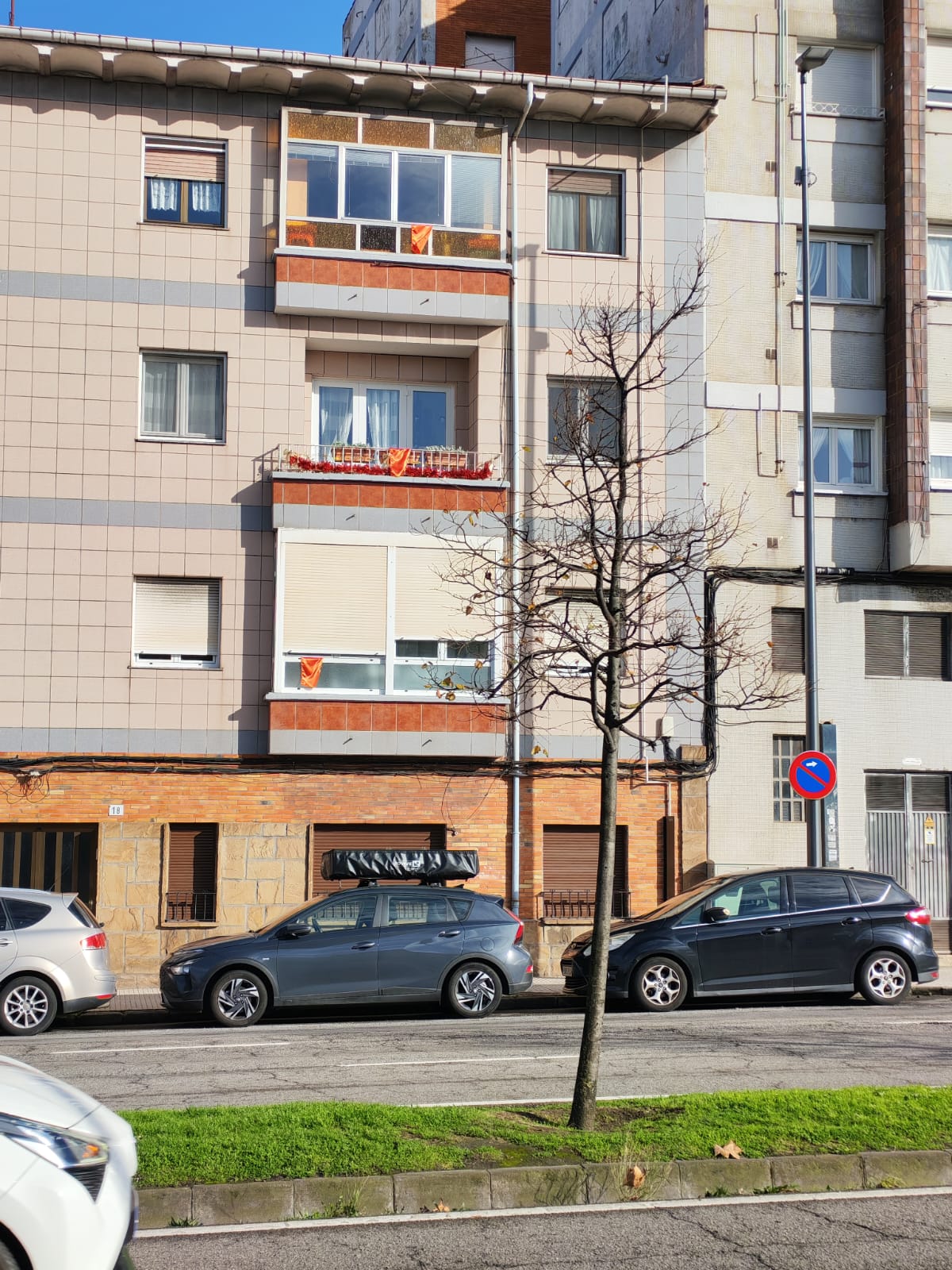 Una vivienda en Príncipe de Asturias con los trapos naranjas colgados de los balcones. / AV La Calzada Alfonso Camín