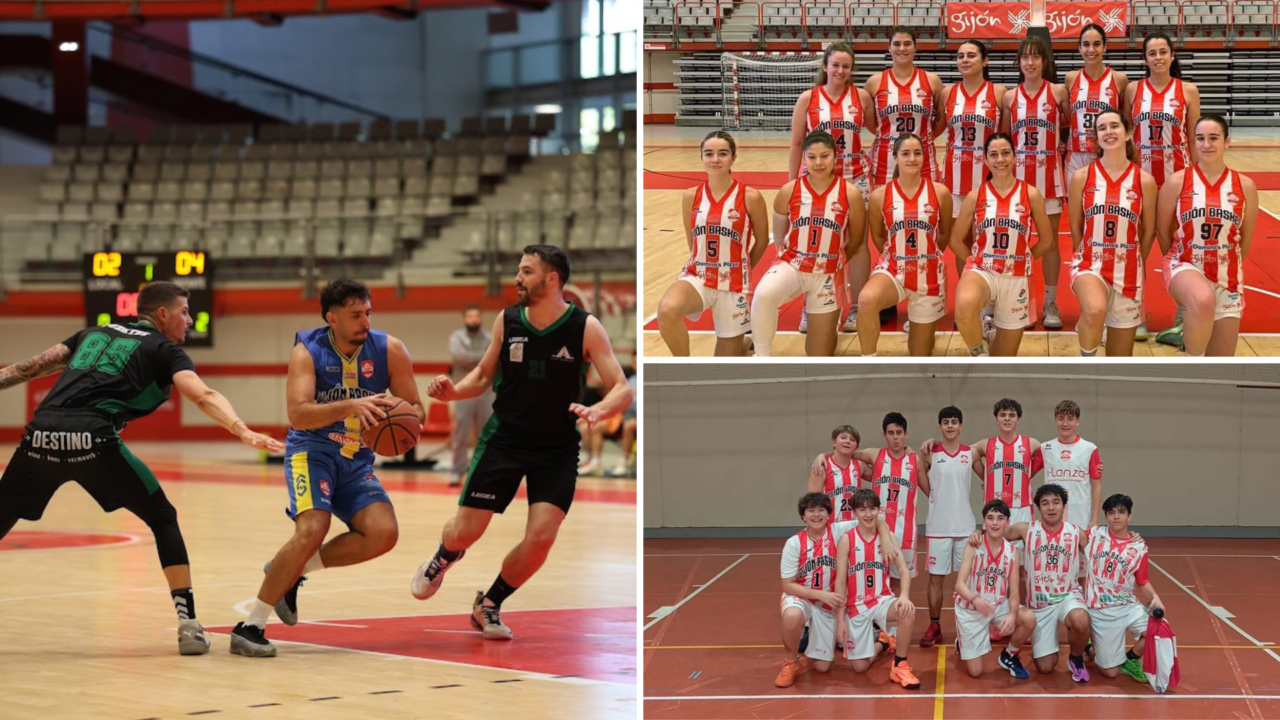 A la izquierda, Diego Barbero entra a canasta nun partíu del senior masculín col Avilés Sur; a la derecha arriba, el senior femenín, y abaxo, el cadete 3 depués d’una victoria. / Sergiosfotos y Gijón Basket