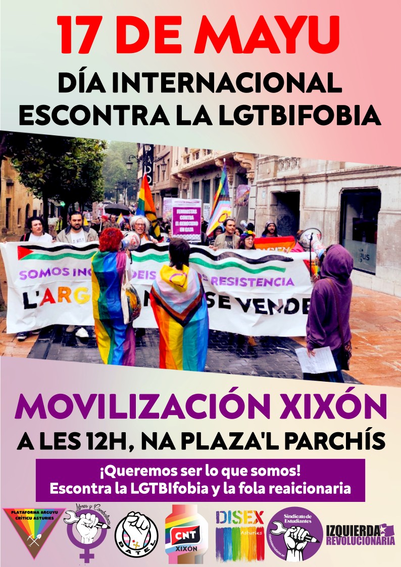 Este sábado se conmemora el Día Internacional contra la LGTBIfobia, una fecha que busca concienciar sobre la discriminación y abusos que, aún hoy, sufren en las personas homosexuales, transexuales y bisexuales por el mero hecho de serlo. Una fecha marcada en rojo para el colectivo en Asturias, que este año volverá a salir a la calle para reivindicar unos derechos que, si bien están recogidos en el papel, muchas veces se ven mermados en su día a día. Así, bajo el lema «¡Queremos ser lo que somos! Escontra la LGTBIfobia y la fola reaicionaria», distintas organizaciones sociales, sindicales y estudiantiles convocan a una movilización a las 12 horas de este sábado en la plaza del Parchís de Gijón.