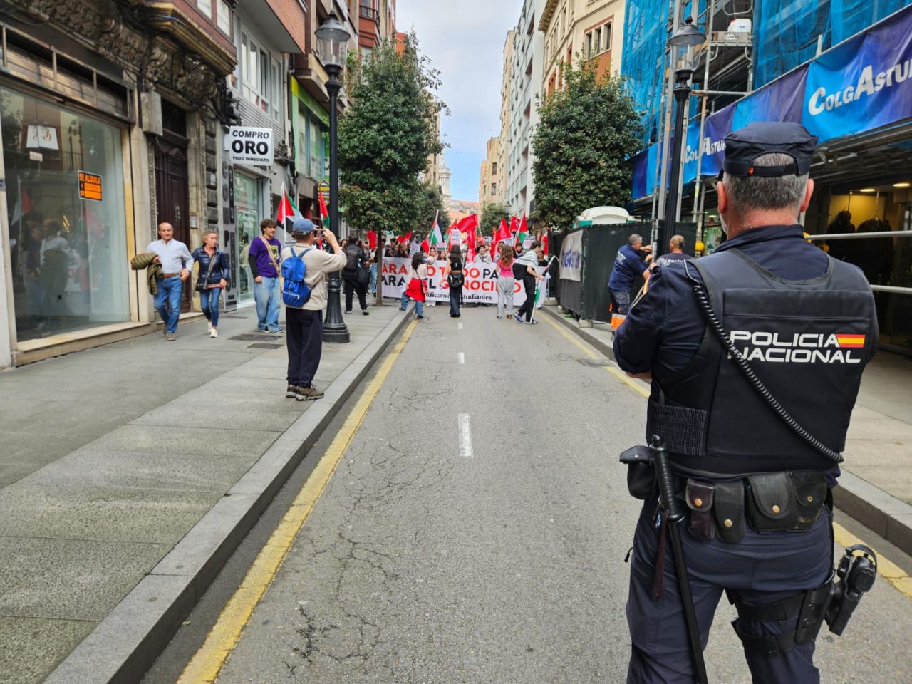 Por fin, pasadas las doce por ocho minutos y fuertemente escoltados por agentes de la Policía Local y de la Nacional, incluidas tres furgonetas de la Unidad de Intervención Policial (UIP) de ese segundo cuerpo, los manifestantes emprendieron el camino hacia el Consistorio de Gijón. Y no sin sorpresas, ciertamente… Un primer intento de seguir la ruta habitual de las comitivas organizadas por el Sindicato de Estudiantes, calle de la Merced adelante hasta la plaza Mayor, tuvo que ser modificado sobre la marcha por las fuerzas policiales, dado el volumen de participantes, inesperadamente alto. Así, la manifestación regresó a El Parchís y, una vez reorganizada, enfiló Menéndez Valdés hasta la plazuela de San Miguel, desde donde, calle Capua mediante, recorrió la sección noroccidental del Muro hasta alcanzar la meta. Un trayecto que se cubrió en más de una hora, marcado por las decenas de banderas ondeantes y pancartas desplegadas, y cuyo son fueron las consignas proferidas por los asistentes. Las iniciales y tibias «Desde el cielo hasta el mar Palestina vencerá» o «Dónde están, no se ven, las sanciones a Israel» no tardaron en dar paso a mensajes más combativos, como «Estado sionista, estado terrorista» o «Israel asesina, Europa patrocina«… Y fue cuestión de tiempo que se diese el salto a máxima aún más expeditivas, de entre las que destacaron «Ayuso, sionista, estás en nuestra lista» y «Trump y Netanyahu son la misma mierda«.