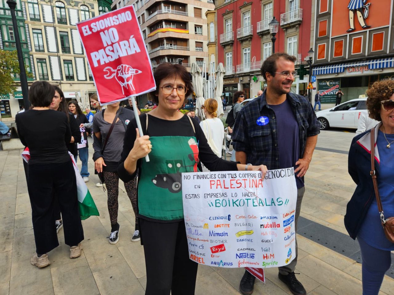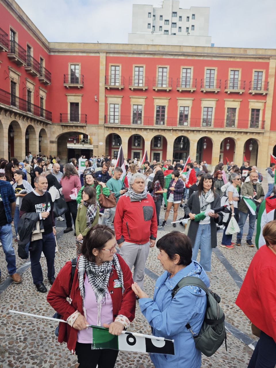 Casi una hora antes de la salida de la marcha desde El Parchís, las inmediaciones de la Casa Consistorial vivieron un primer conato de lo que poco después sucedería. Con los relojes marcando las once, y cumpliendo con los dictados de los paros parciales convocados por Comisiones Obreras (CCOO) y Unión General de Trabajadores (UGT), unas cincuenta personas, muchas ataviadas con la tradicional kufiya palestina y enarbolando las banderas de dicho pueblo, se concentraron frente a la sede del Gobierno gijonés para visibilizar su indignación con las acciones perpetradas por el Estado hebreo en Gaza en estos veinticuatro meses, y para pedir que se inviertan todos los recursos necesarios para prevenir su repetición. Entre ellas fue posible ver a los representantes municipales del PSOE, de Izquierda Unida (IU) y de Podemos. Finalmente, tras unos veinte minutos de consignas y arengas, esa primera protesta se disolvió y varios de sus miembros pusieron rumbo a El Parchís, donde ya aguardaban los alumnos solidarizados con la protesta. Entre estos últimos estuvieron los jóvenes Adrián Polonio, Carmen Suárez y Norma Martínez, convencidos de que el plan de paz suscrito no debe, en absoluto, marcar el fin de la lucha. «No podemos olvidar todo lo sucedido, y tenemos que seguir defendiendo la idea de que no se puede repetir, como ya ha sucedido en el pasado«, coincidieron. A pocos metros de ellos la veterana Aurora Junquera, llegada de la protesta frente al Ayuntamiento, reconocía que la de hoy «es una huelga ética; hemos de dar visibilidad a lo que ha sido un mirar para otro lado de todos los Gobiernos«.