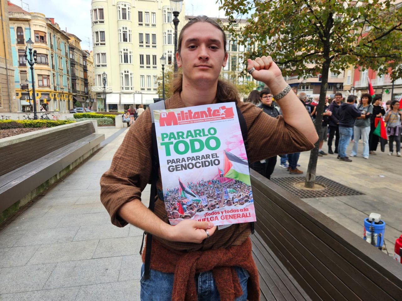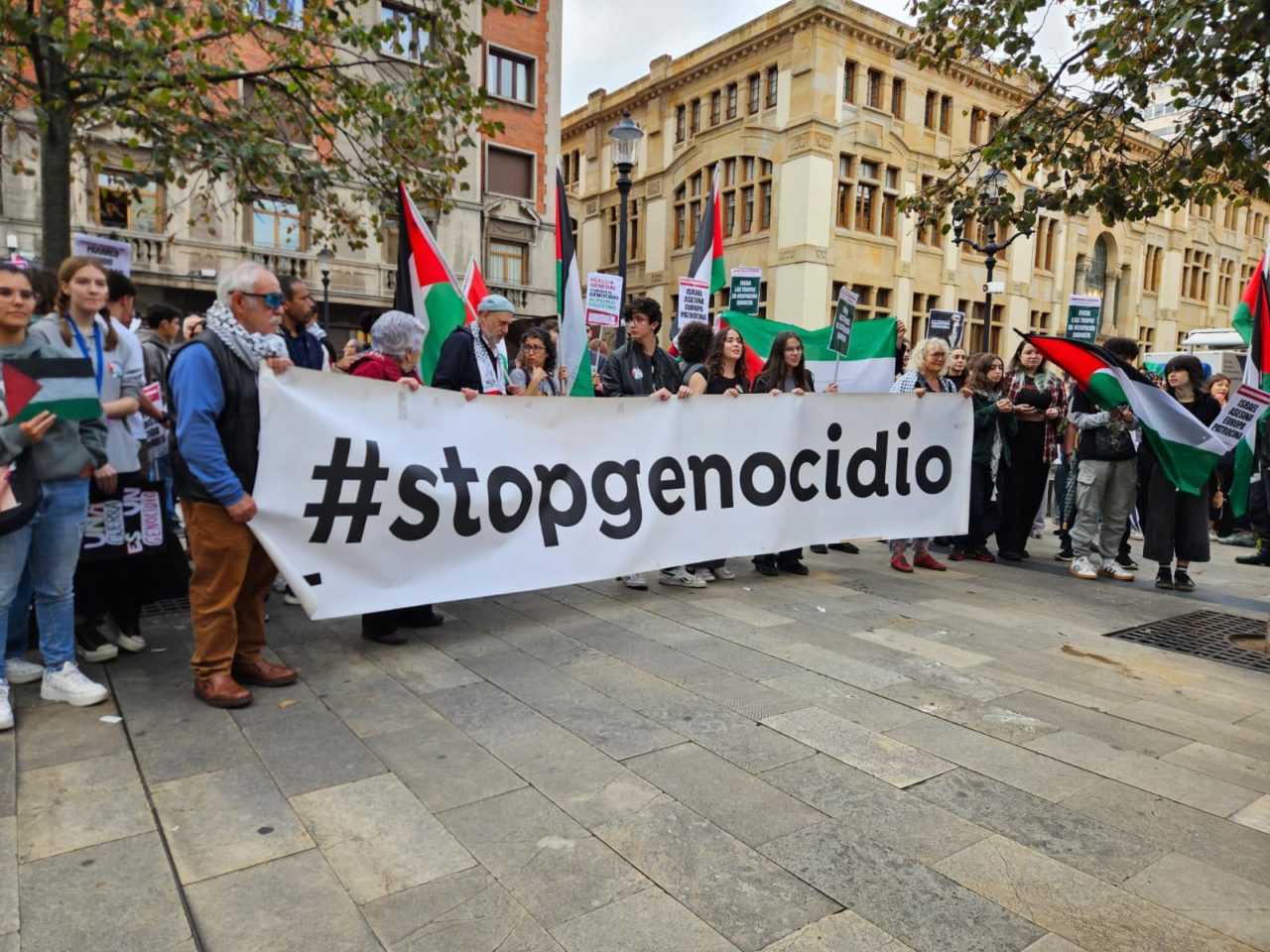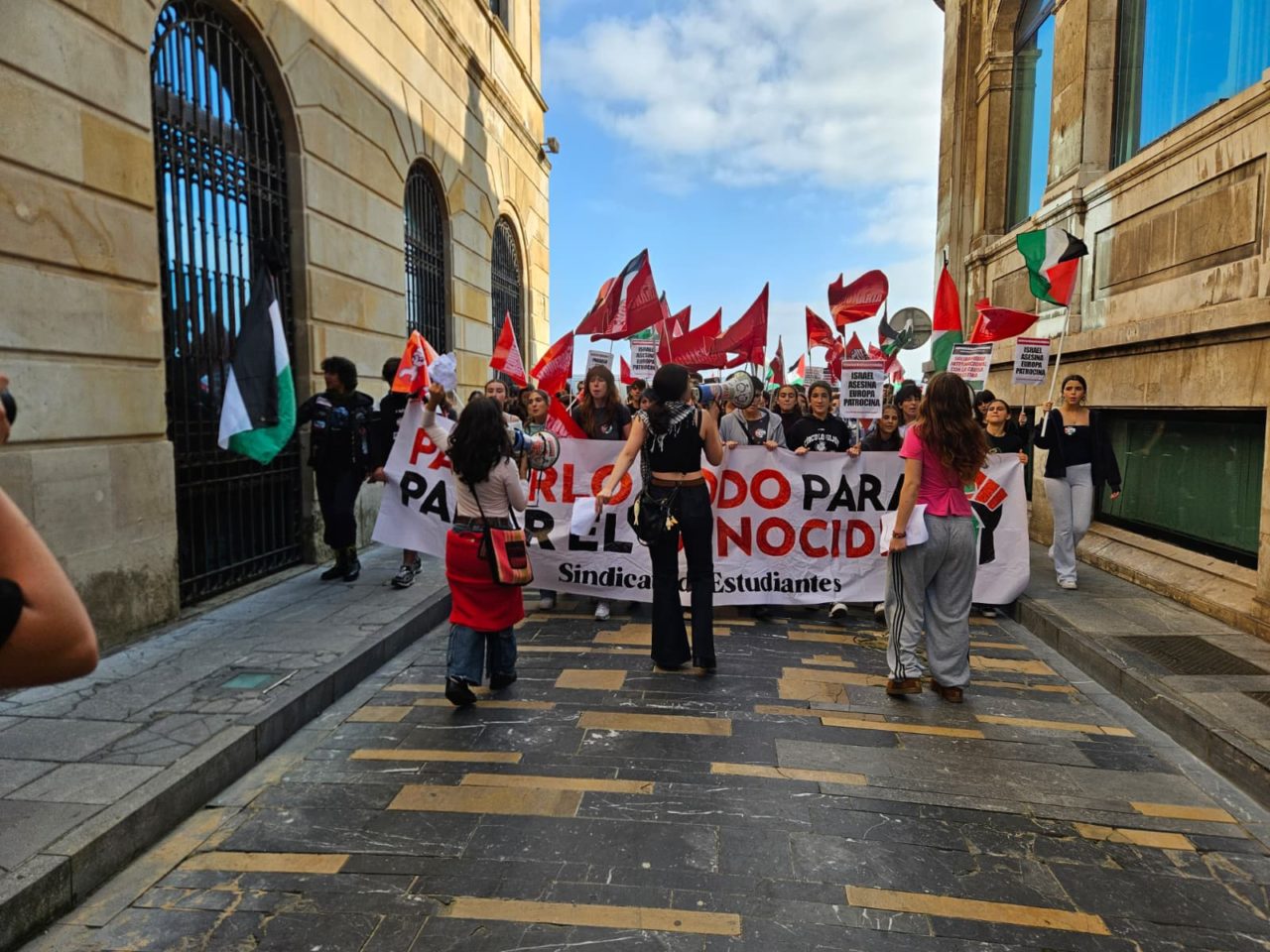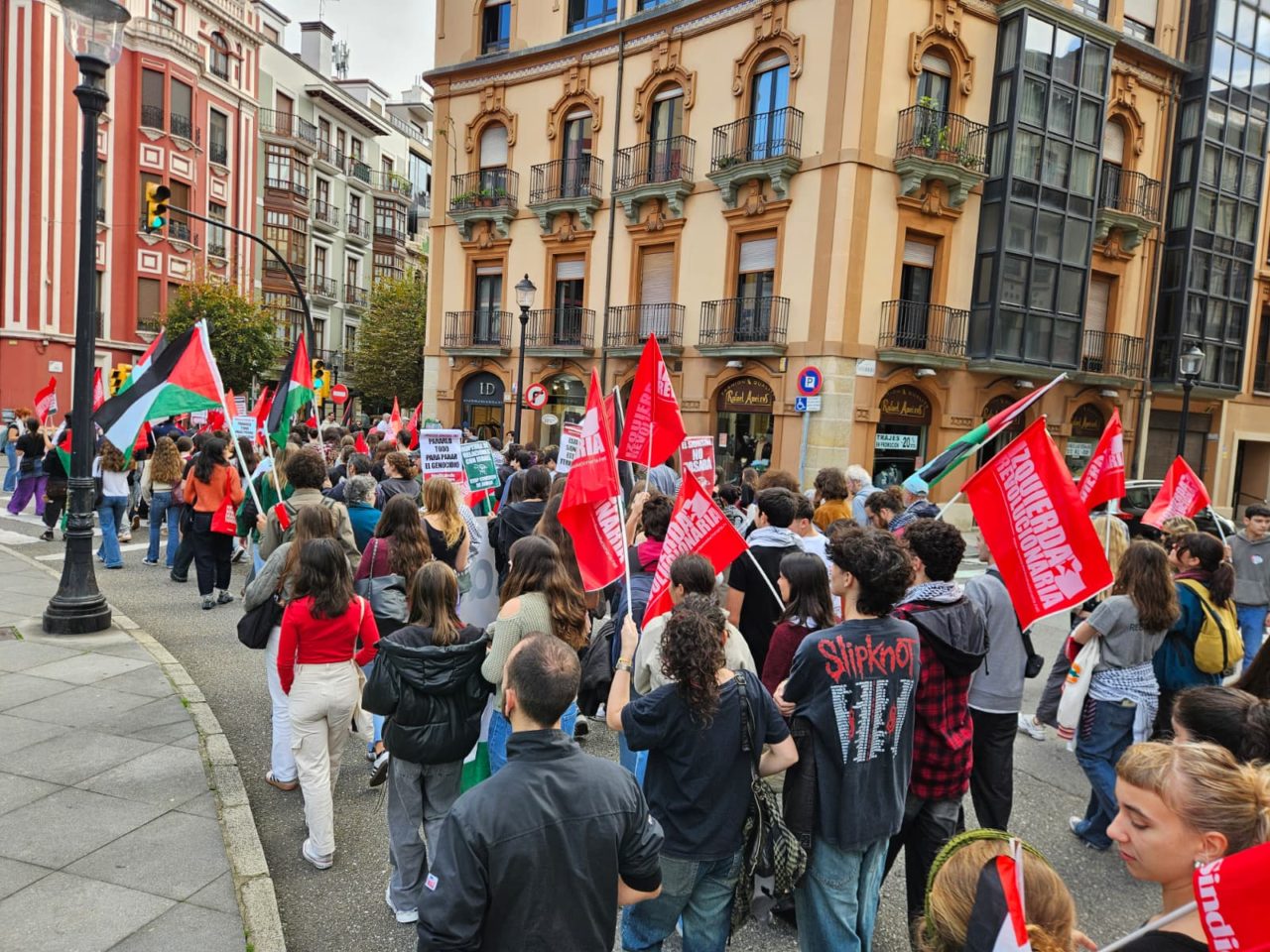 Al fin, con el trazado cubierto y los estudiantes y simpatizantes ocupando parte de la plaza Mayor, tomó la palabra Jessica Mejía, portavoz del Sindicato de Estudiantes y designada para leer el manifiesto redactado al efecto. Ante la atenta mirada de los transeúntes y clientes de los negocios hosteleros cercanos Mejía, armada con un megáfono, recordó a propios y a ajenos que «la jornada de hoy forma parte de una rebelión imparable en todo el mundo contra el sionismo, contra todos los Gobiernos e instituciones cómplices con el Holocausto al pueblo palestino, y contra el sistema capitalista que hace posible todo este horror». Fue la antesala de un mensaje que enfatizó el carácter «criminal» de la matanza cometida por Israel en la Franja, y en el que se insistió en que «la paz de los genocidas no es paz; es una farsa para coronar el genocidio, para convertir Palestina en una colonia y para arrebatar al pueblo palestino el derecho a existir». Su cierre, aplaudido y coreado, resultó tajante… La de Gaza y Palestina es, en suma, «la causa de la Humanidad». Todo un colofón para el entremés de la gran manifestación general convocada por los sindicatos que esta tarde, a las 19 horas, partirá desde El Humedal.