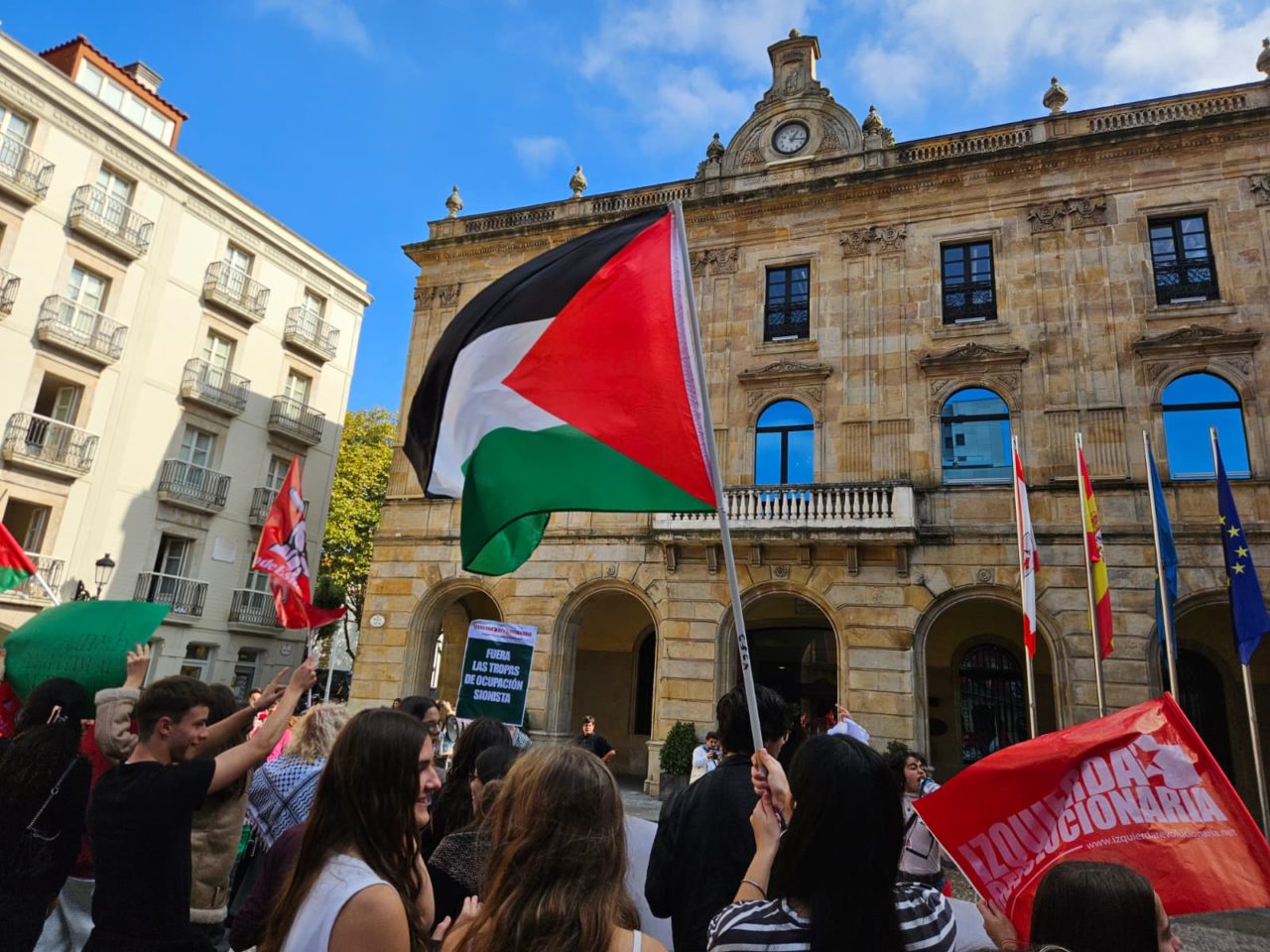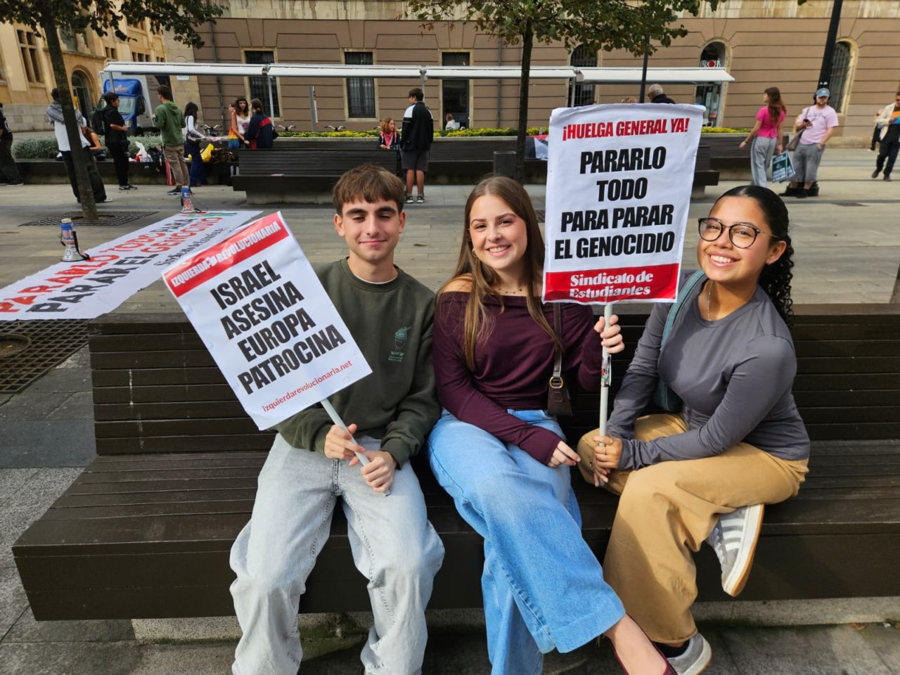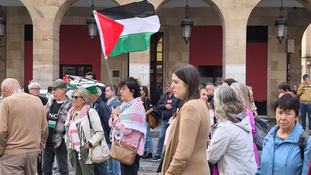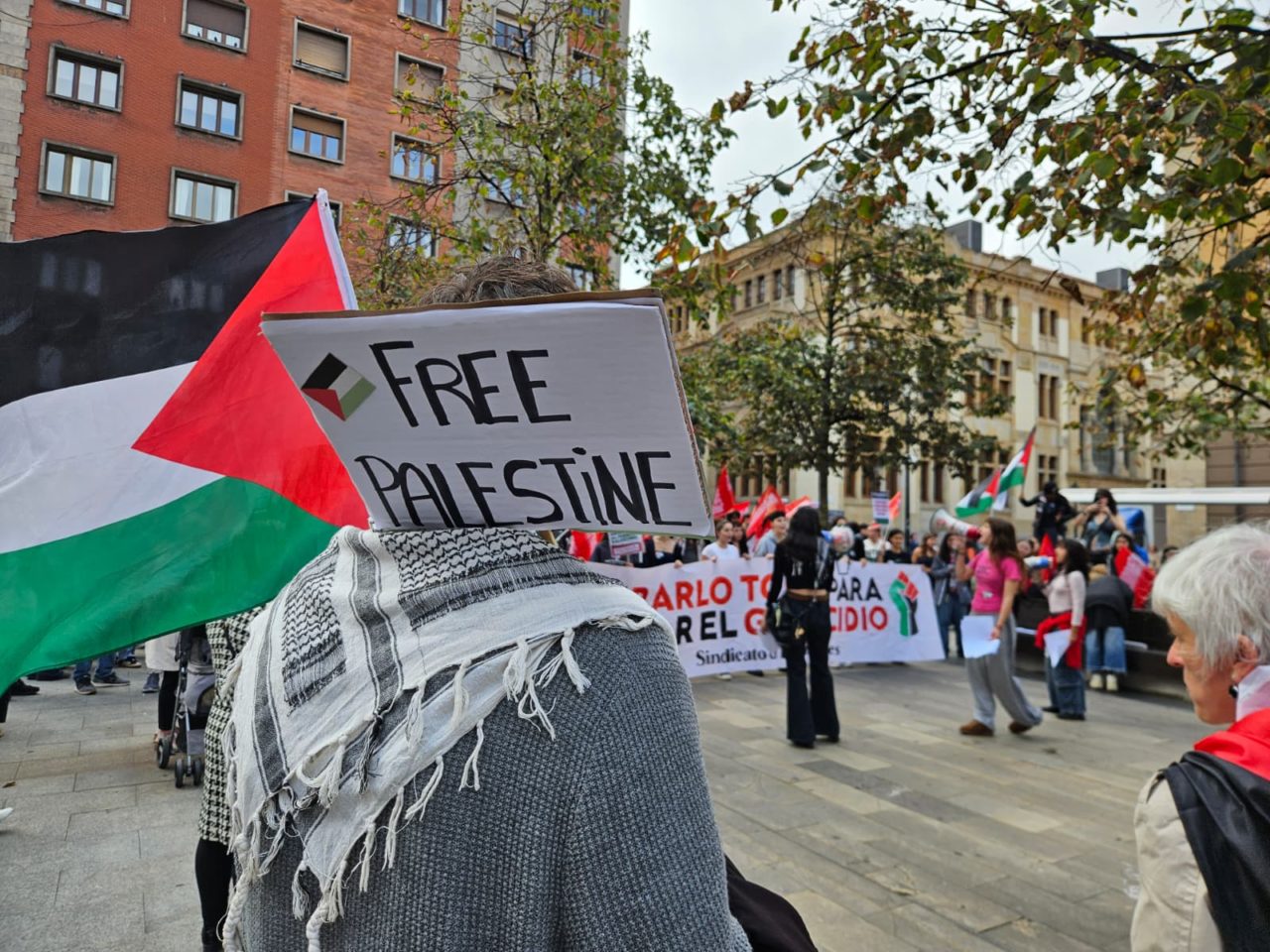 Al fin, con el trazado cubierto y los estudiantes y simpatizantes ocupando parte de la plaza Mayor, tomó la palabra Jessica Mejía, portavoz del Sindicato de Estudiantes y designada para leer el manifiesto redactado al efecto. Ante la atenta mirada de los transeúntes y clientes de los negocios hosteleros cercanos Mejía, armada con un megáfono, recordó a propios y a ajenos que «la jornada de hoy forma parte de una rebelión imparable en todo el mundo contra el sionismo, contra todos los Gobiernos e instituciones cómplices con el Holocausto al pueblo palestino, y contra el sistema capitalista que hace posible todo este horror». Fue la antesala de un mensaje que enfatizó el carácter «criminal» de la matanza cometida por Israel en la Franja, y en el que se insistió en que «la paz de los genocidas no es paz; es una farsa para coronar el genocidio, para convertir Palestina en una colonia y para arrebatar al pueblo palestino el derecho a existir». Su cierre, aplaudido y coreado, resultó tajante… La de Gaza y Palestina es, en suma, «la causa de la Humanidad». Todo un colofón para el entremés de la gran manifestación general convocada por los sindicatos que esta tarde, a las 19 horas, partirá desde El Humedal.