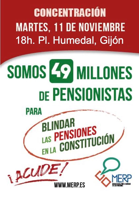 La Mesa Estatal por el Blindaje de las Pensiones (MERP), formada por 537 organizaciones en todo el país, sale a la calle el martes 11 de noviembre en 100 poblaciones para exigir ‘un candado para las pensiones como mejor forma de defender el Estado del Bienestar’.