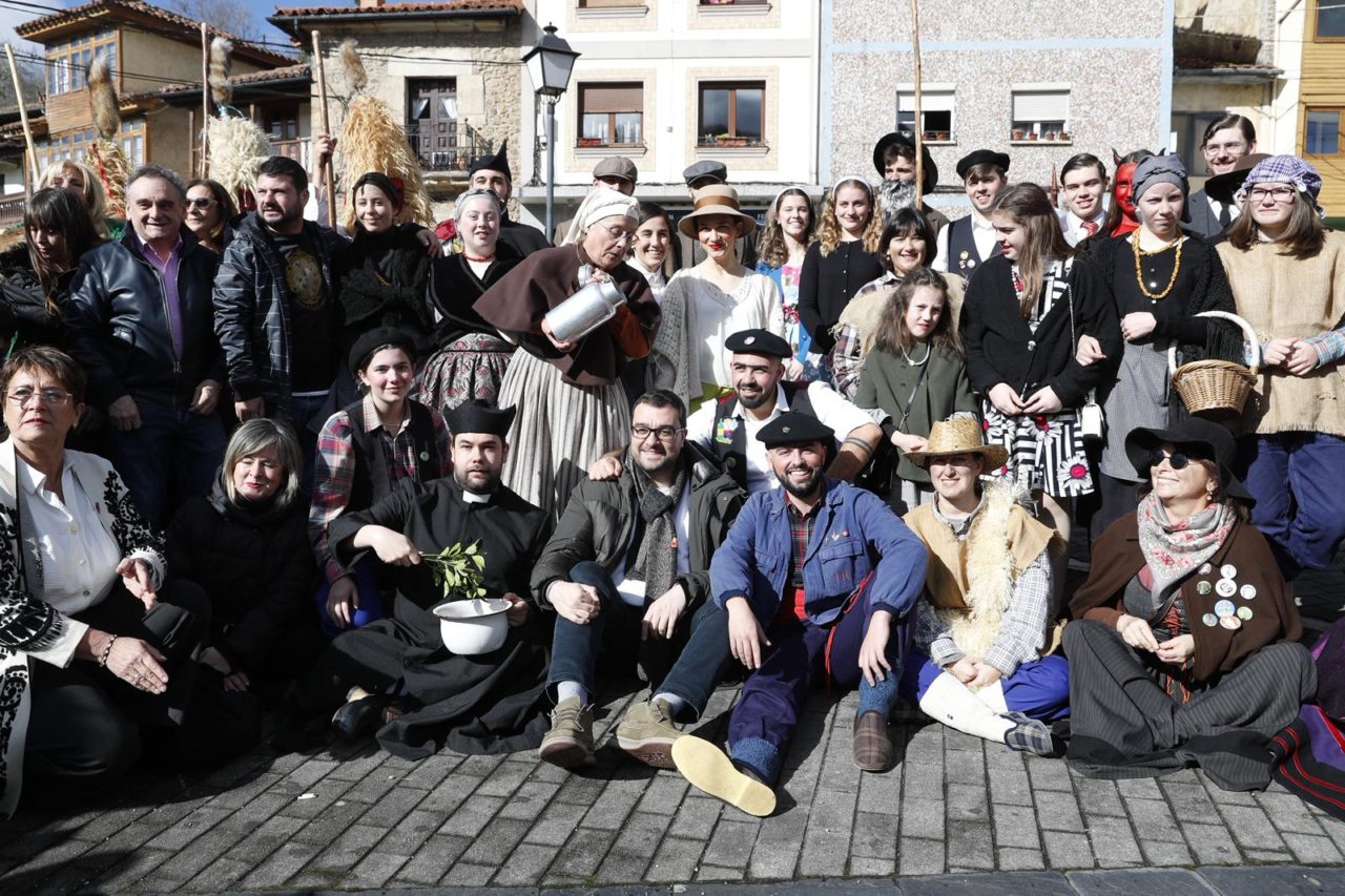 • Miembros de la mazcarada posen xunto a Barbón y l’alcalde, García Corte, segundu pela izquierda, de pie. / Gobiernu d’Asturies