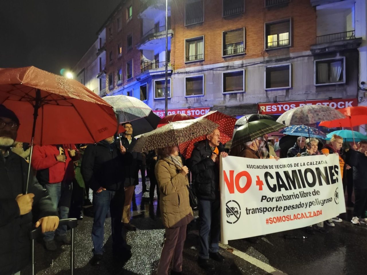 El tiempo no acompañó, «con ventisca, un día de perros», pero armados de paraguas, los vecinos de La Calzada volvieron a responder por tercer miércoles consecutivo a la llamada para reclamar la salida del tráfico pesado de Cuatro Caminos. «Estamos muy contentos otra vez con la participación a pesar de no ser un día fácil», apunta Carlos Arias, presidente de la Asociación Vecinal La Calzada Alfonso Camín, colectivo convocante que en esta ocasión dio el micrófono a Alberto Riera, médico cardiólogo del Hospital de Jove, para la lectura del manifiesto después del apoyo mostrado por el Comité de Empresa del centro sanitario, del que forma parte desde hace 20 años, a la reivindicación.