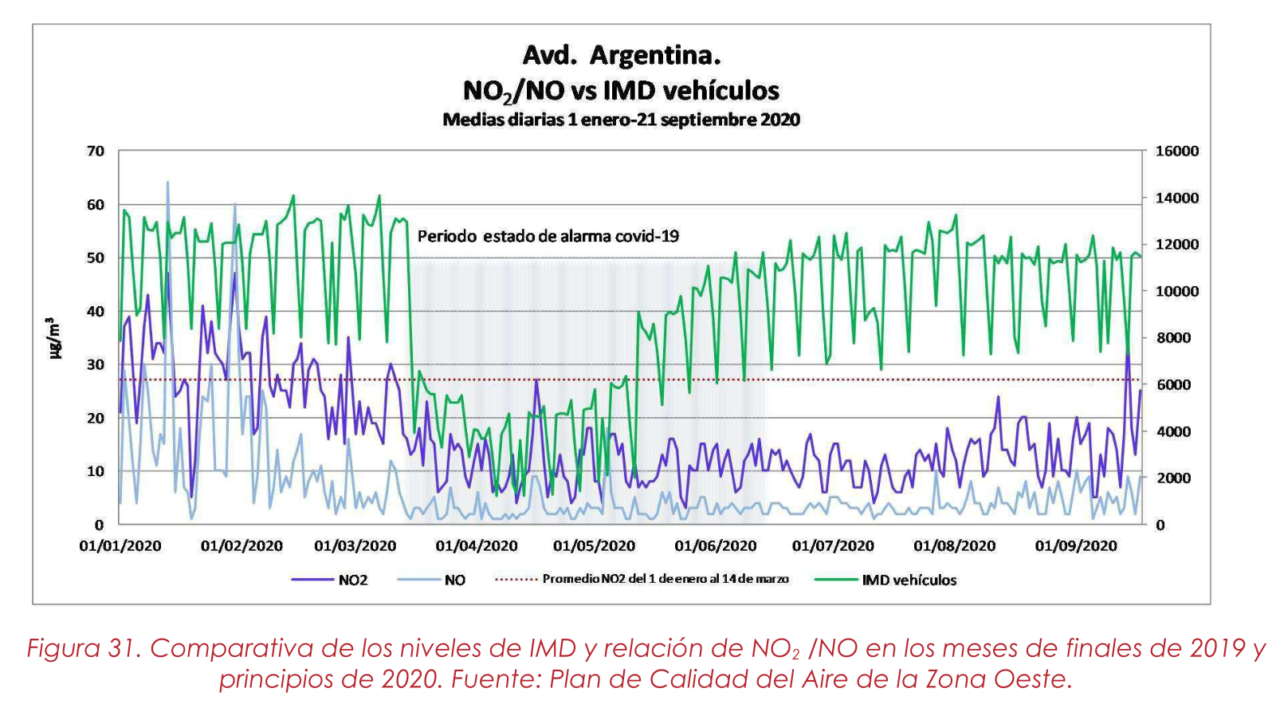 En esta gráfica se puede ver la bajada drástica de las emisiones asociadas al tráfico durante los momentos del COVID y recogidas por la estación de la avenida de Argentina, pese a que la industria seguía a pleno rendimiento.
