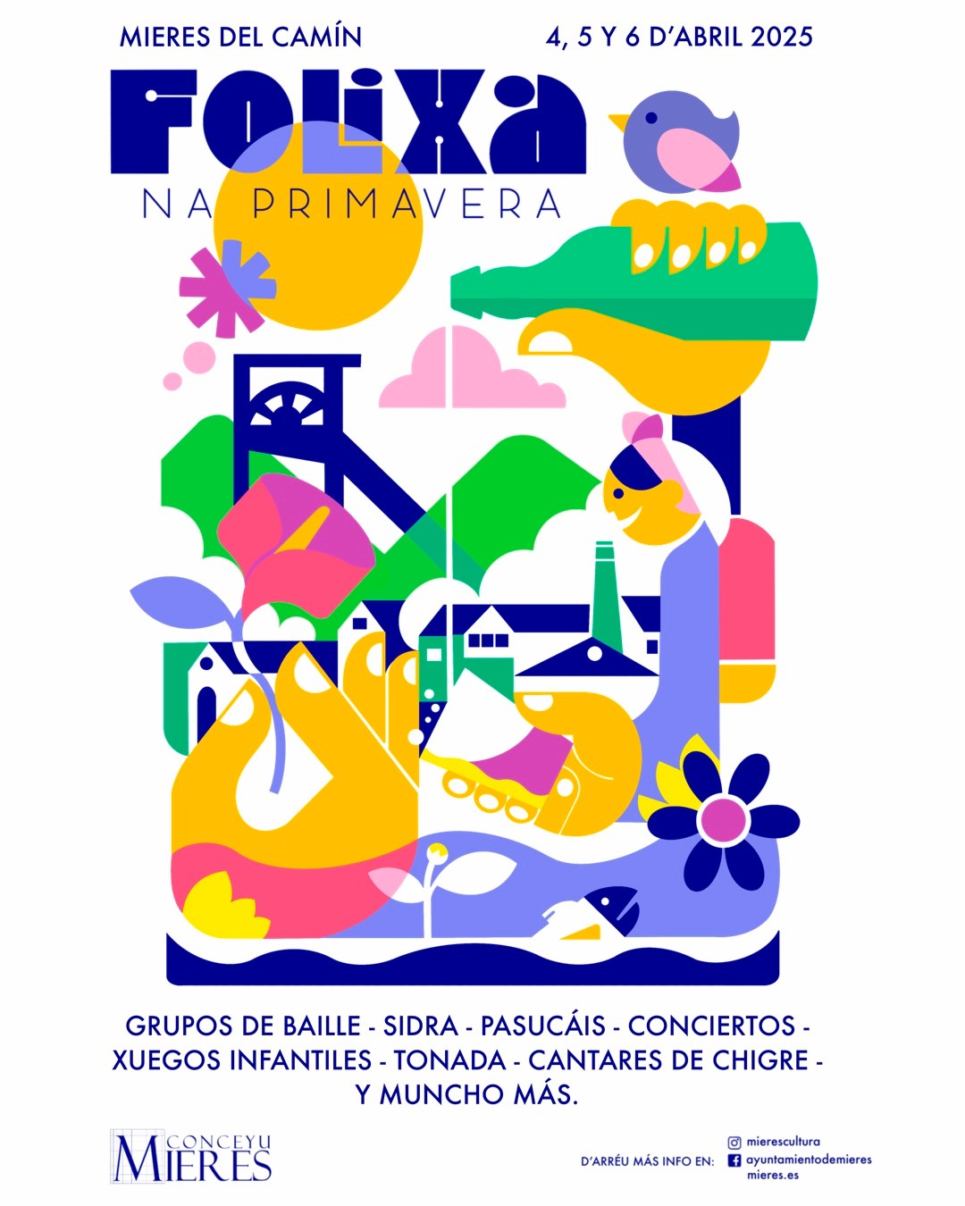 Mieres se prepara para celebrar una nueva edición de la Folixa na Primavera, una de las festividades más destacadas del calendario municipal y autonómico. El evento tendrá lugar del 4 al 6 de abril y, como cada año, reunirá a vecinos y visitantes en torno a la tradición, la sidra, la música y la gastronomía. Desde la Concejalía de Festejos, dirigida por Rocío Antela, se está ultimando el programa completo de actividades, que se hará público en los próximos días. Mientras tanto, ya se ha presentado el cartel oficial de la Folixa, obra del diseñador gijonés Foni Ardao. El diseño refleja la identidad del concejo y la esencia de la celebración, con elementos representativos como la sidra, los pozos mineros, el río y edificaciones características, todo ello enmarcado en una composición colorida con predominio de tonos azules, verdes y amarillos.