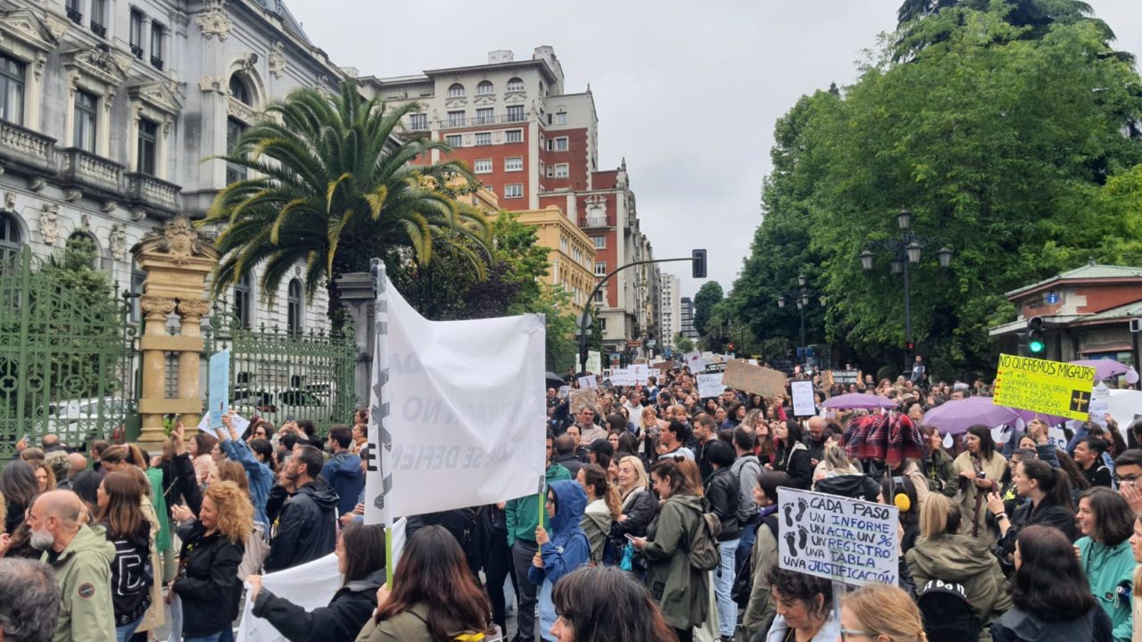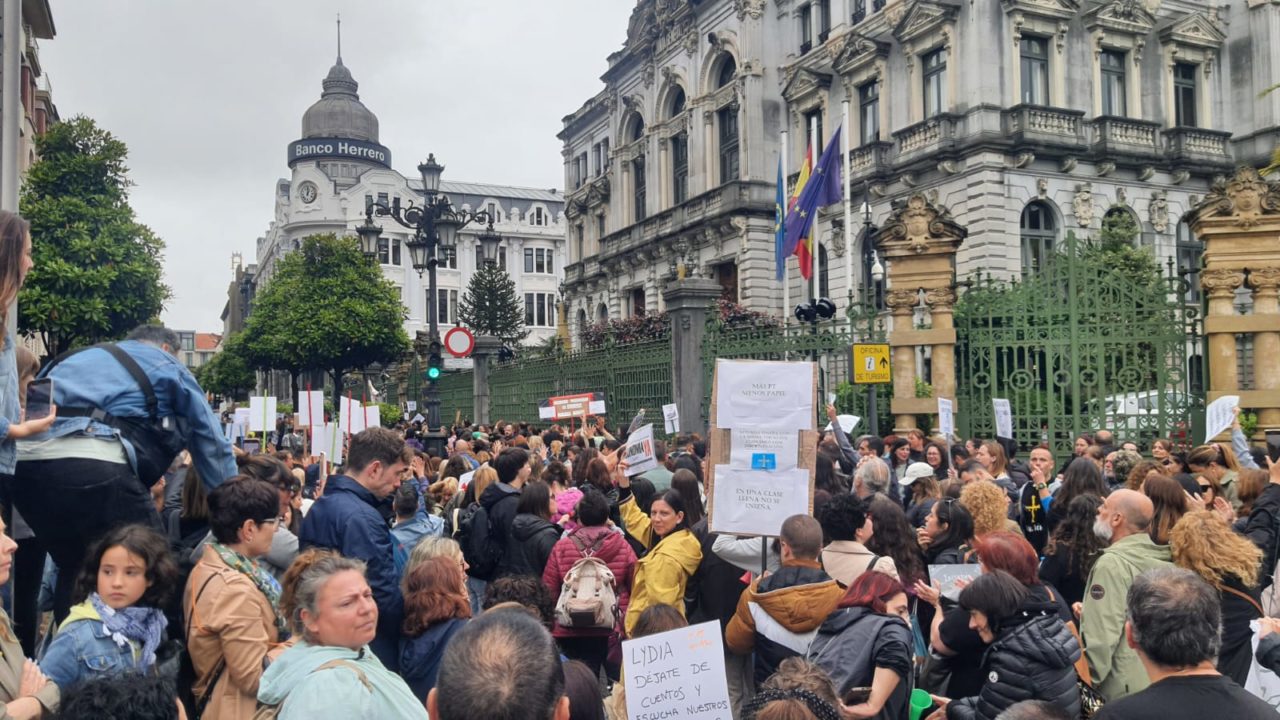 La comunidad educativa ha vuelto a llenar este lunes las calles de Oviedo en el primer día de huelga indefinida convocada de forma conjunta por los cinco principales sindicatos del sector, CCOO, UGT, SUATEA, ANPE y CSIF. Pese a la lluvia persistente y a la dimisión esa misma mañana de la consejera de Educación, Lydia Espina, miles de docentes participaron en una nueva movilización que partió desde la Delegación de Educación hasta la Junta General del Principado. Con camisetas negras como símbolo de protesta —ya conocidas como la “marea negra” de la educación—, el profesorado volvió a exigir al Gobierno asturiano medidas concretas que mejoren sus condiciones laborales y refuercen la educación pública.