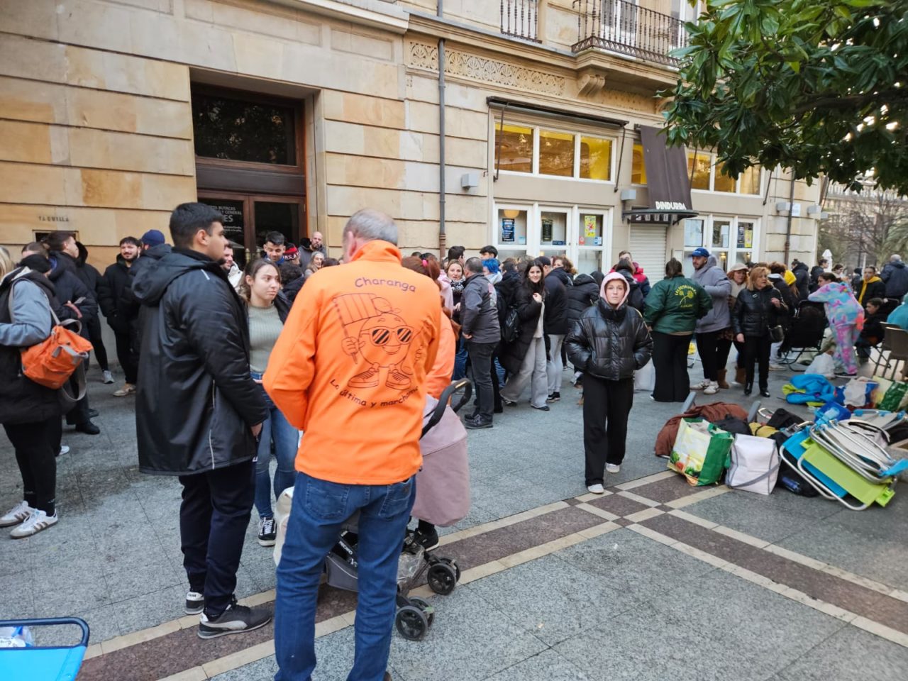 Decenas de personas hicieron noche ante el Teatro Jovellanos para asegurarse entrada para el XXXVIII Concursu de Charangues en una jornada marcada por las rachas de viento; una tumbona llegó a golpear a un joven, sin necesidad de atención médica