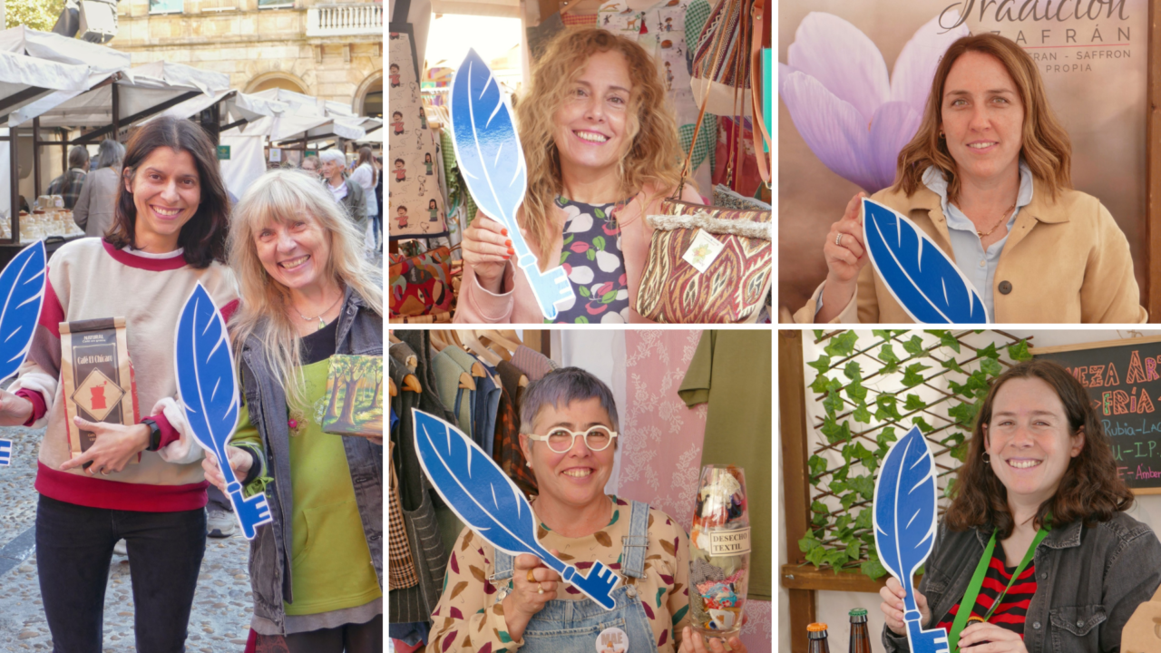 Muyeres que vienden los sos productos nos puestos de la Plaza Mayor posen con una pluma como símbolu d’esta conmemoración. / Mercáu Artesanu y Ecolóxicu