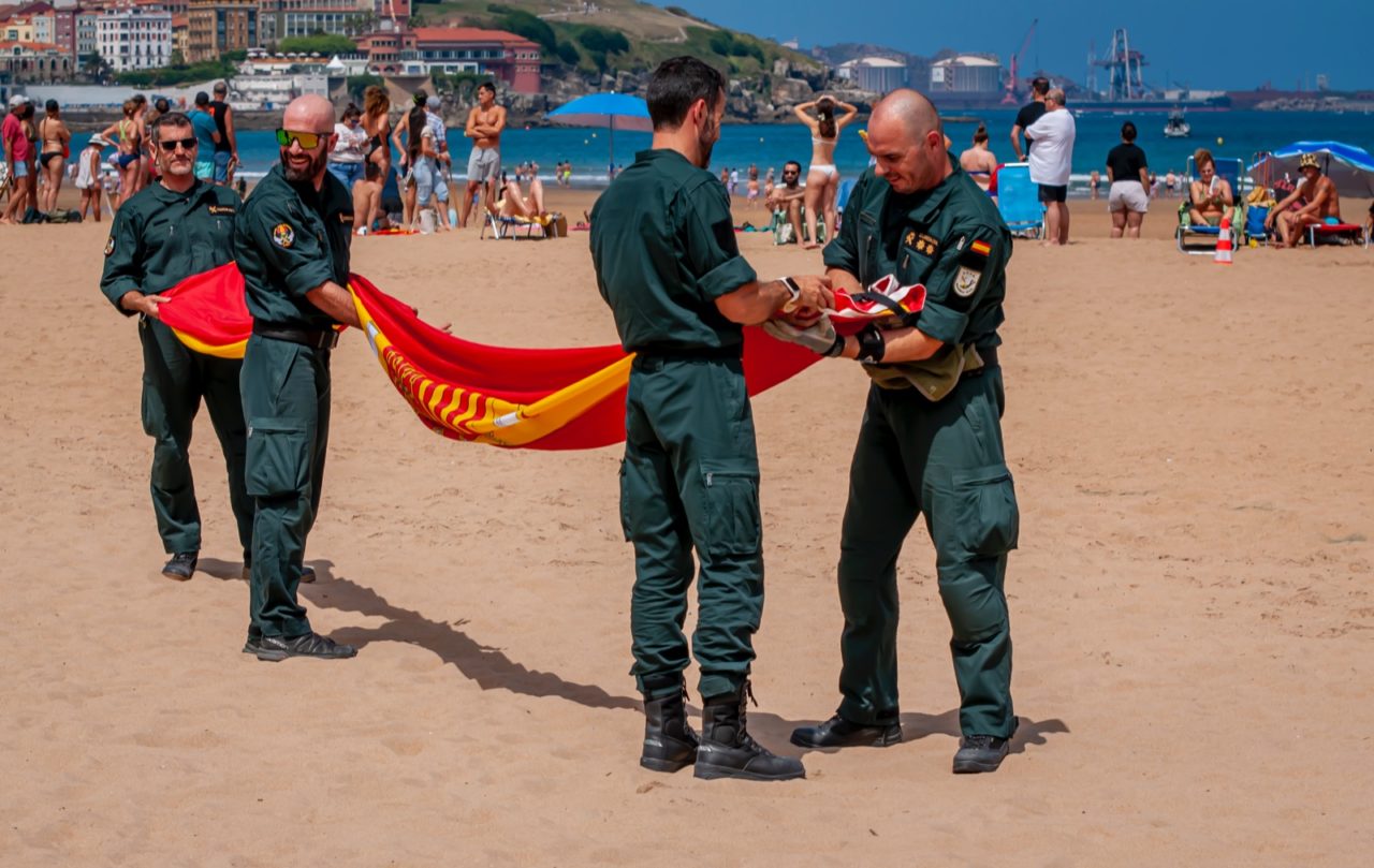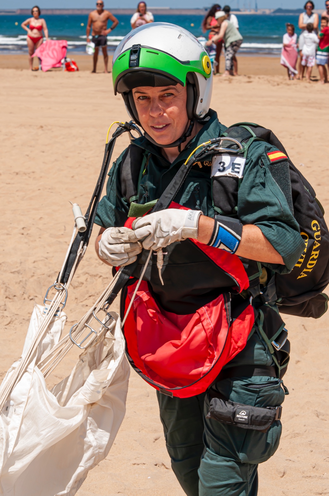 Han pasado unos cuantos meses desde aquel salto con el que la decena de integrantes del equipo se ganó para siempre el corazón de los gijoneses, saltando desde un Eurocopter AS365 Dauphin y desplegando en vuelo una bandera nacional y otra de la Benemérita mientras ejecutaban un descenso de precisión sobre un pequeño punto concreto de la playa de San Lorenzo… Pero, aun así, el teniente coronel Felipe Pizarro, uno de sus dos comandantes, aún se emociona al recordar la experiencia. «Fue inolvidable, un orgullo y un honor, algo digno de repetir«, rememora, evocando aquellos momentos, ya sanos y salvos en tierra, en que «la gente nos paraba para felicitarnos, para pedirnos fotos… Nos sentimos muy arropados«. Y eso que no fueron los únicos profesionales de su clase presentes esos días en el cielo de Gijón; la veterana y laureadísima Patrulla Acrobática de Paracaidismo del Ejército del Aire (PAPEA) compartió firmamento con sus ‘hermanos’ del instituto armado, acumulando también una abrumadora ovación colectiva. Sin embargo, hubo algo especial en el salto protagonizado por Pizarro y sus subordinados… Porque sí, el Festival Aéreo de este año fue el primer evento no deportivo al que se sumó el equipo. Fue la base de una tónica que, poco después, se repitió en Torre del Mar, y que, seguramente, no tardará en incluir nuevos certámenes.
