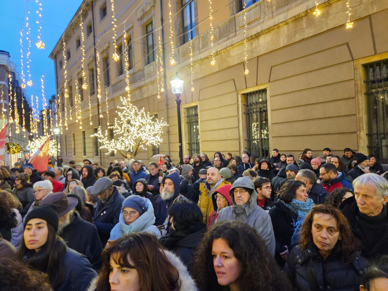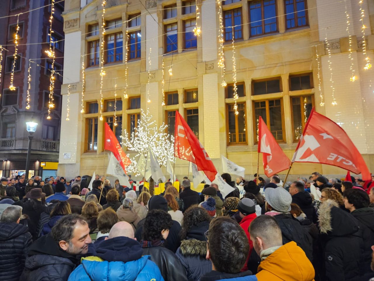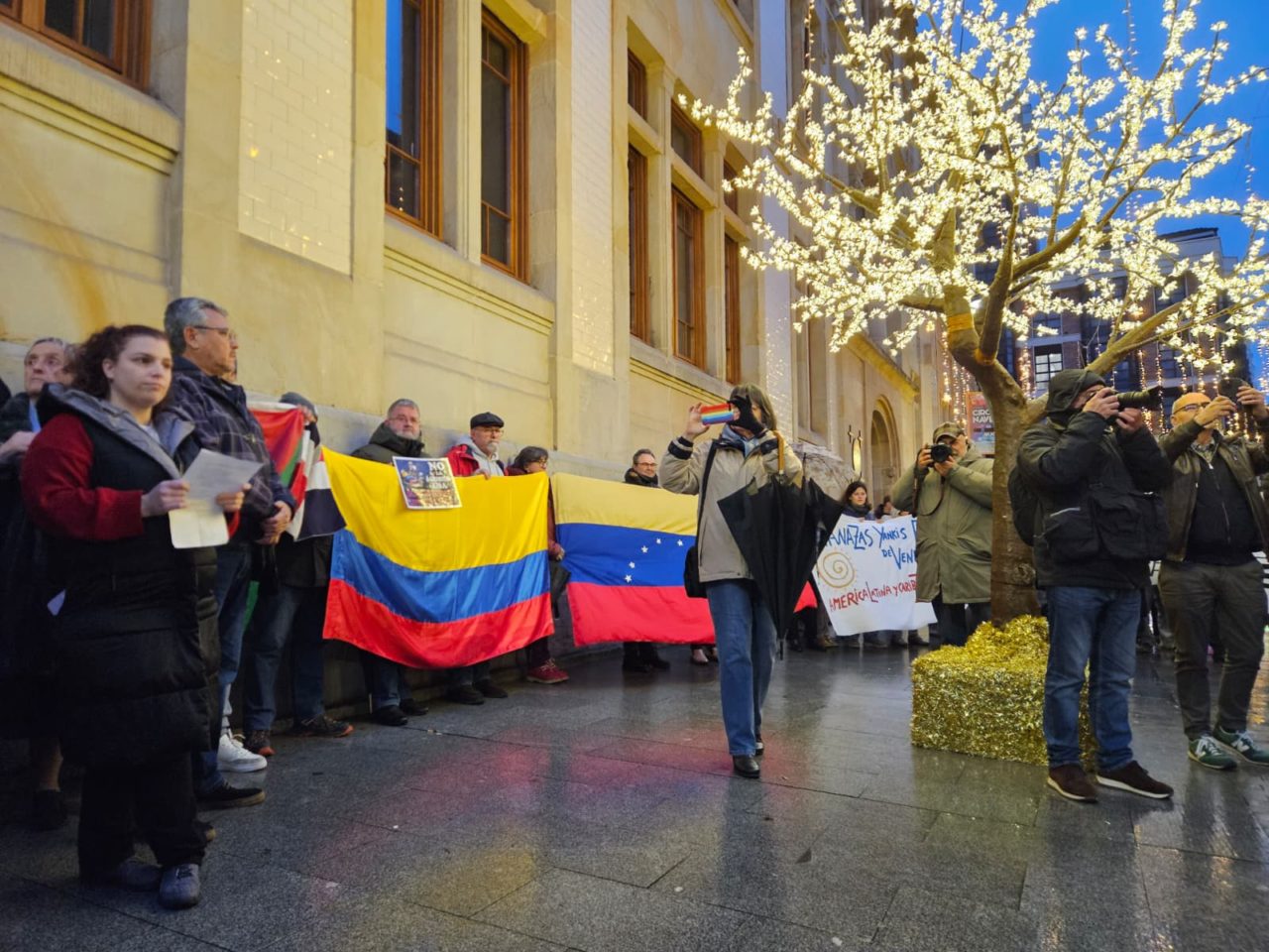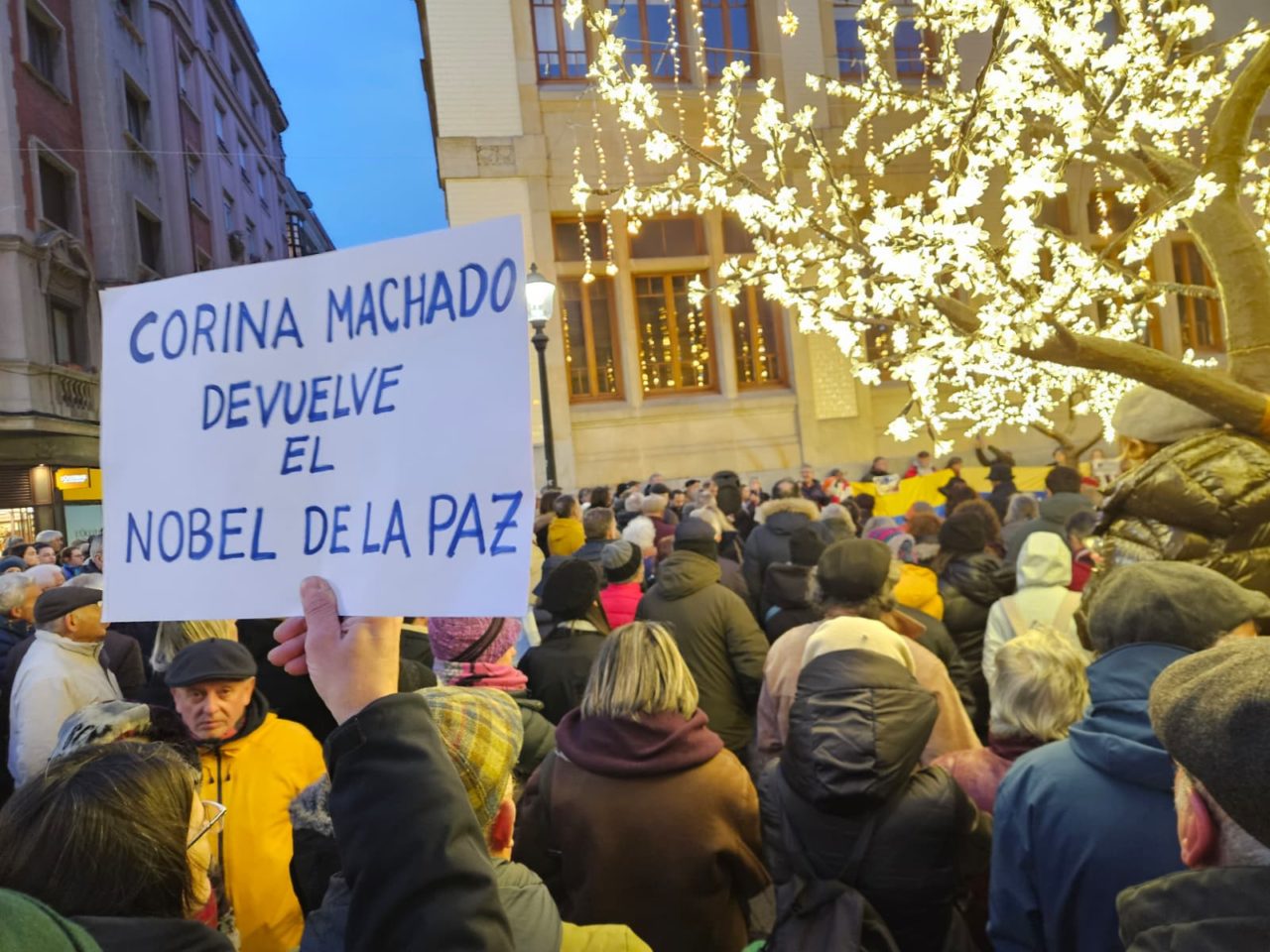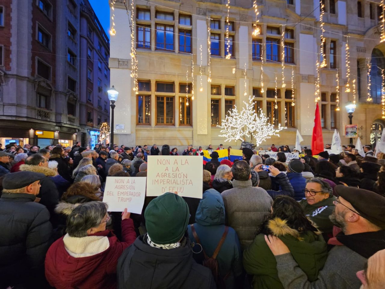 Fueron los segundos, los opositores al ataque estadounidense, los primeros de movilizarse. Atendiendo al llamamiento hecho por el sindicato Comisiones Obreras (CCOO) y la Asociación Soldepaz Pachakuti, cerca de medio millar de personas se concentró en El Parchís a las seis para mostrar no tanto un apoyo a Maduro y su régimen, como un rechazo a una maniobra, la de Estados Unidos, entendida como «un ejercicio de imperialismo intolerable«. Así, como en los años más crudos del intervencionismo norteamericano en América Latina, el grito «Yankees go home!» volvió a resonar, acompañado de consignas como «¡Nazis fuera!» u «¡OTAN no, bases fuera!«; mensaje ese último que sintetiza el deseo, expresado desde la esfera política por fuerzas como el Partido Comunista (PC), Izquierda Unida (IU) o Podemos, presentes en el acto, de que España rompa relaciones con Estados Unidos y abandone la Alianza Atlántica. Bajo la tenue lluvia, e iluminados por el alumbrado navideño, los participantes escucharon, en primer lugar, a Javier Orozco Peñaranda, coordinador del colectivo de colombianos refugiados en Asturias -muchos de ellos con vínculos familiares con Venezuela-, quien no dudó en tachar lo acontecido al otro lado del Atlántico como «una agresión ilegal, un matonismo muy peligroso para la paz, que el mundo debe repudiar«.