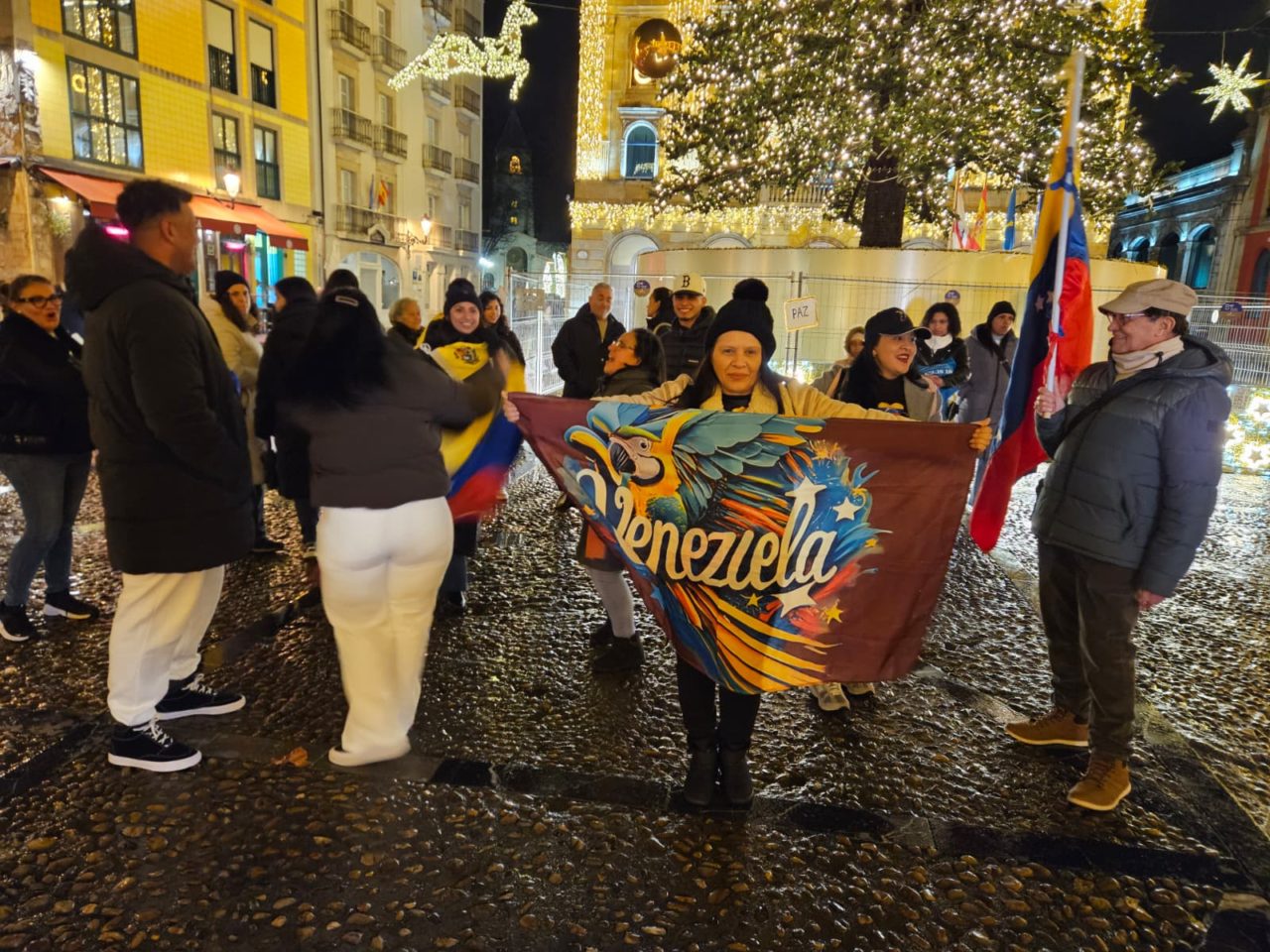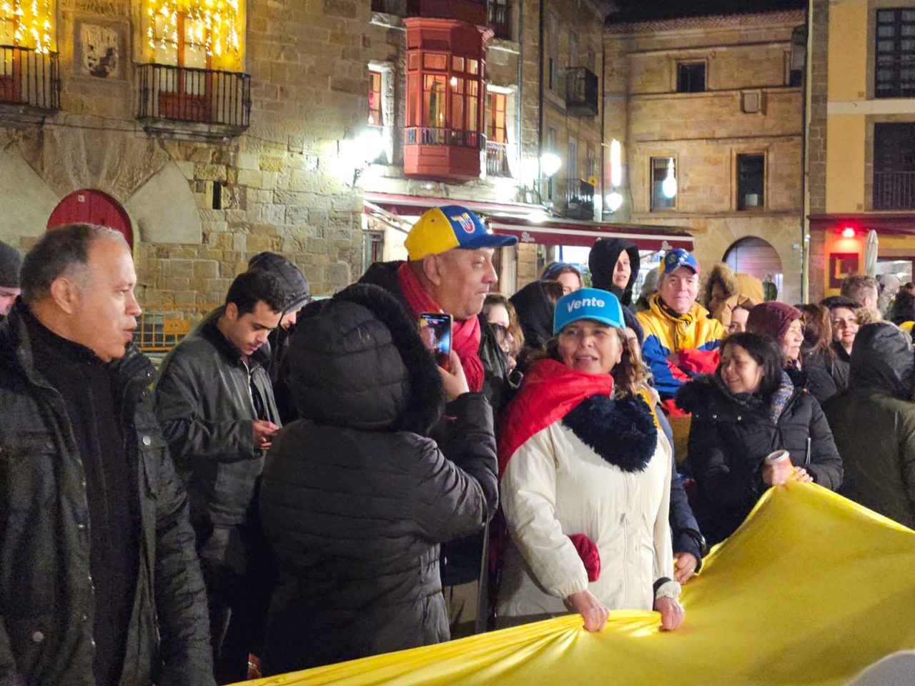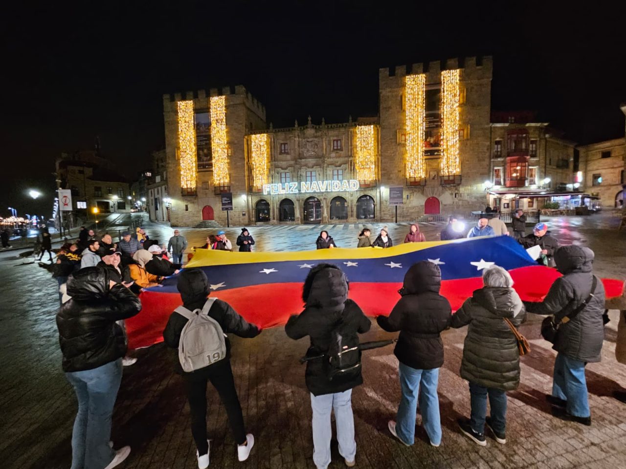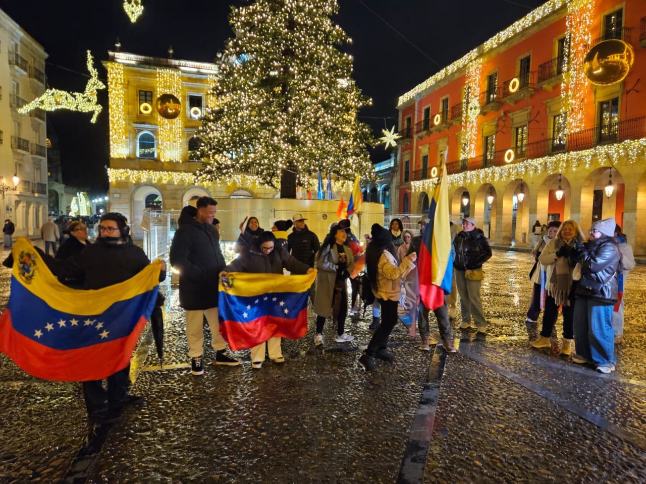 Sin embargo, la captura, extracción y encarcelamiento de Maduro ha generado un punto de vista alternativo: el de aquellos, fundamentalmente venezolanos emigrados, que secundan, aplauden y hasta bendicen el asalto estadounidense y al mismísimo Donald Trump. Y ayer estos últimos no se quedaron de brazos cruzados. Tras saber de la convocatoria crítica en El Parchís, el Comandito Voto Mundial Abierto Libertad Sin Fronteras, que coordina desde Gijón la opositora al chavismo Charo Pérez, organizó a toda prisa una concentración propia a las siete, en la plaza Mayor, para dar visibilidad al júbilo de la jornada. Ahora bien, ya fuese por la lluvia y el frío imperantes, por el escaso margen de tiempo desde la emisión de la convocatoria -los mensajes comenzaron a circular a las cinco de la tarde- o por alguna otra razón, apenas una veintena de personas respondieron al aviso. Eso sí, lo hicieron enarbolando pancartas y banderas venezolanas, cantando, bailando y agradeciendo lo que es visto por ellos como una liberación. «Los chavistas declararon una guerra contra la humanidad; lo que hicieron ha sido peor que una bomba atómica«, declaró Pérez… Instantes después de que un espontáneo español que transitaba por la plaza espetase a los concentrados que «el tirano Maduro ha sido reemplazado por el tirano Trump». Al oír tales palabras, varios venezolanos participantes en el acto se encararon con él, acusándole de «chavista» e intentando expulsarle del espacio. Por fortuna, la cosa no pasó de lo verbal.