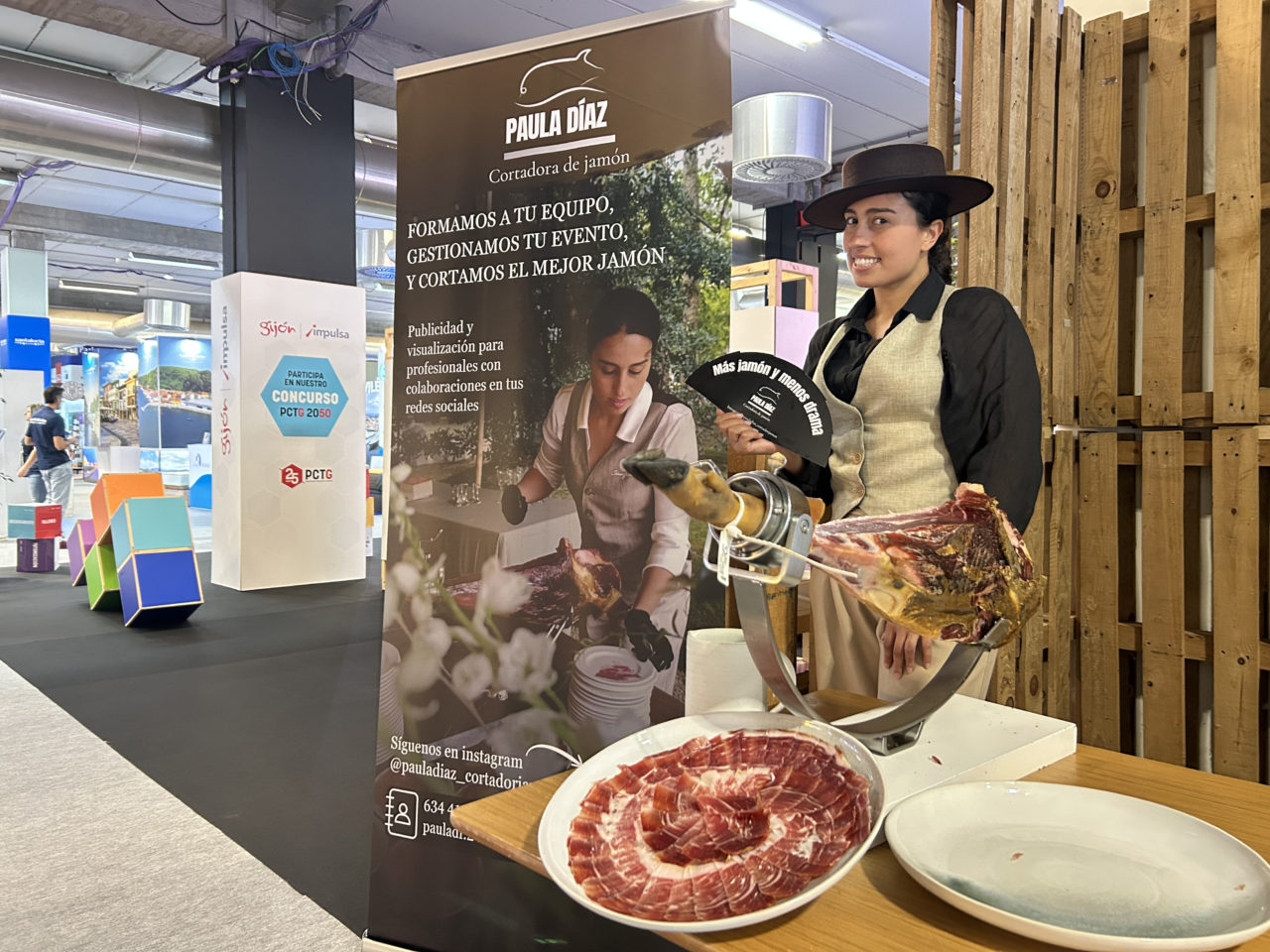 La catarsis de Díaz con la actividad que ha llegado a ser su leitmotiv se produjo, precisamente, durante sus tiempos de alumna en el Conservatorio Profesional de Música y Danza de la ciudad. «Para no depender económicamente de mis padres, empecé a trabajar a media jornada en una tienda bar en la que vendían embutidos y cortaban jamón«, recuerda. Pronto, muy pronto, lo que comenzó siendo un mero complemento para costear los estudios pasó a ser una auténtica vocación, y Díaz no tardó en decidirse a cambiar el arco por el cuchillo. Cumpliendo con esa máxima de que la preparación hace al maestro, a esa práctica empírica inicial le siguió el adiestramiento en profundidad. Así, cuenta con orgullo que «me formé con los grandes y, un día, vi un nicho de mercado en dedicarme a esto en exclusiva; no como extra de otra cosa, sino plenamente«. A partir de ahí, todo fue cuestión de trabajo, constancia, una pizca de buena suerte… Y visibilidad. Presente en bodas y eventos, el coto de caza habitual del corte, pero también en celebraciones familiares, talleres y otros acontecimientos menos usuales, Díaz no tardó el lograr una presencia mediática relevante, en especial gracias a su perfil de Instagram @pauladiaz_cortadorjamon. Fue a partir de entonces cuando fraguó en su mente la idea de la agencia… Y cuando se le ocurrió llamar a la puerta de Gijón Impulsa.