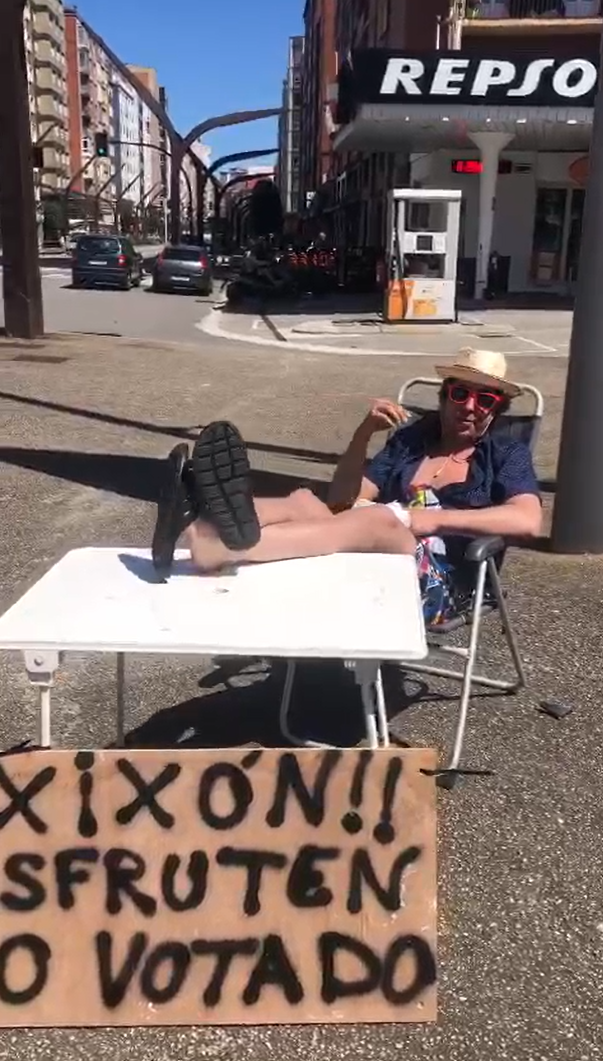 La protesta más original de lo que llevamos de año. Así podríamos describir la acción llevada a cabo en Gijón por un joven que, ataviado con bermudas, camisa abierta, gorro, gafas, chanclas, un paquete de pipas y el cartel ‘Xixón, disfruten lo votado’, pudieron ver los gijoneses que pasaron por el cruce entre la avenida de la Constitución y la avenida Manuel Llaneza. Tras la protesta, tal y como adelanta LNE, se encuentra el gijonés Víctor Manuel Monestina González, que cuenta con un amplio historial de «protestas curiosas» a sus espaldas.